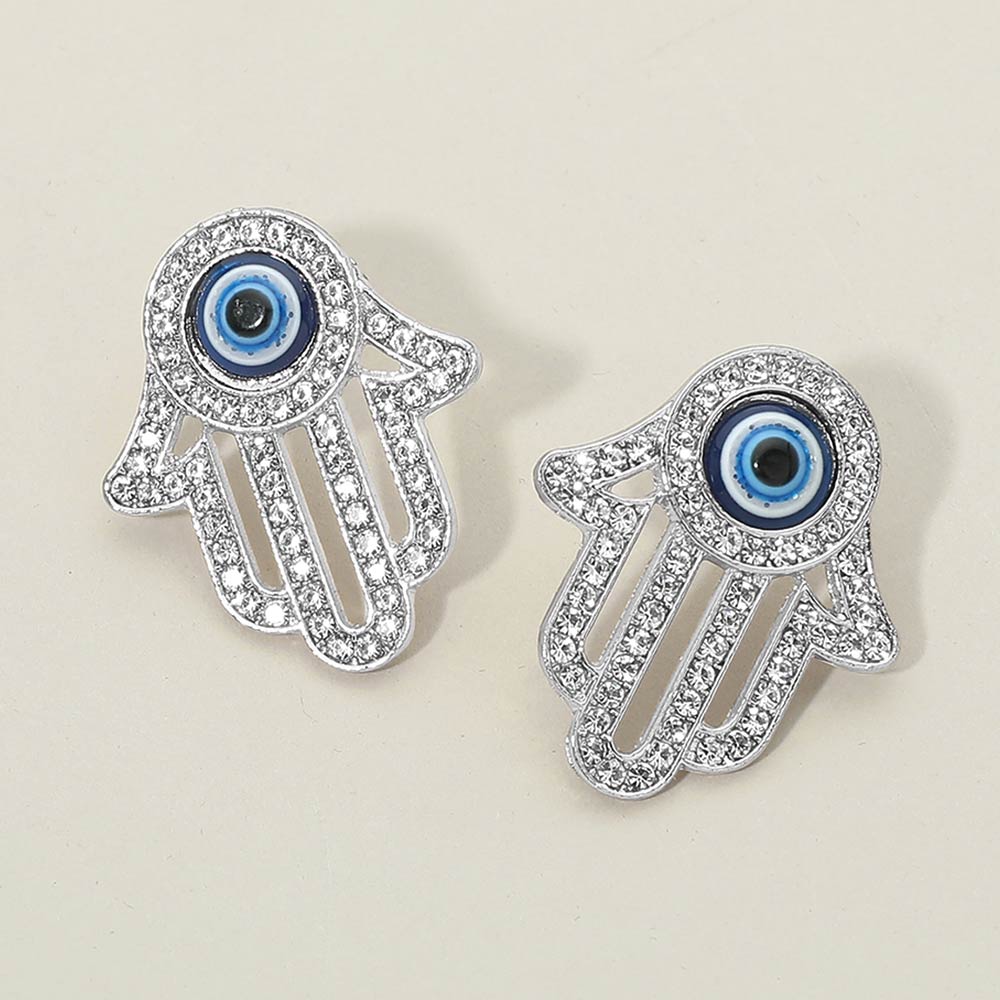 • Protective stud earrings designed in a symbolic hand silhouette featuring an evil eye center and pavĂ©-style accents. Lightweight and comfortable for daily wear, they add meaning and sparkle to any look. Ideal for everyday styling, gifting, layering with other earrings, and adding a timeless spiritual touch to modern accessory collections.