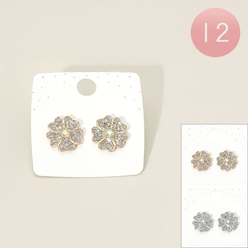 Details • Size : 0.75" X 0.75" • Post Back • Elegant floral stud earrings with sparkling rhinestones and a shimmering center. Perfect for adding a subtle touch of charm to any look.