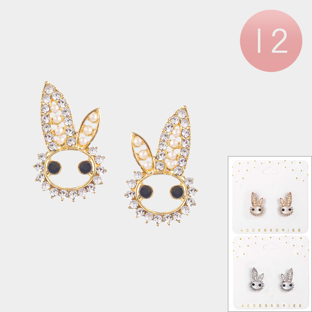 12Pairs - Stone Pearl Paved Bunny Stud Earrings