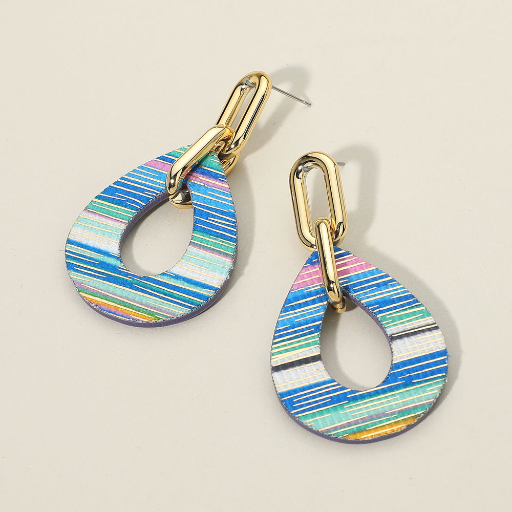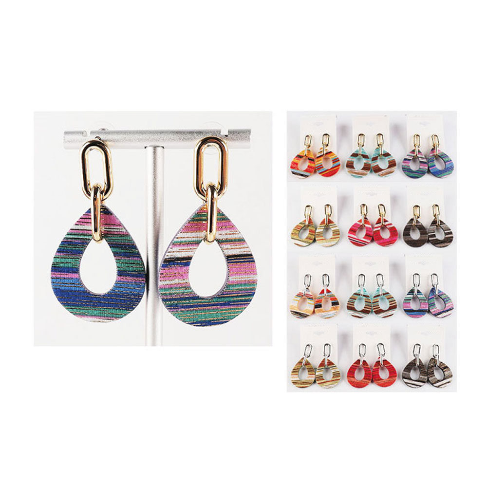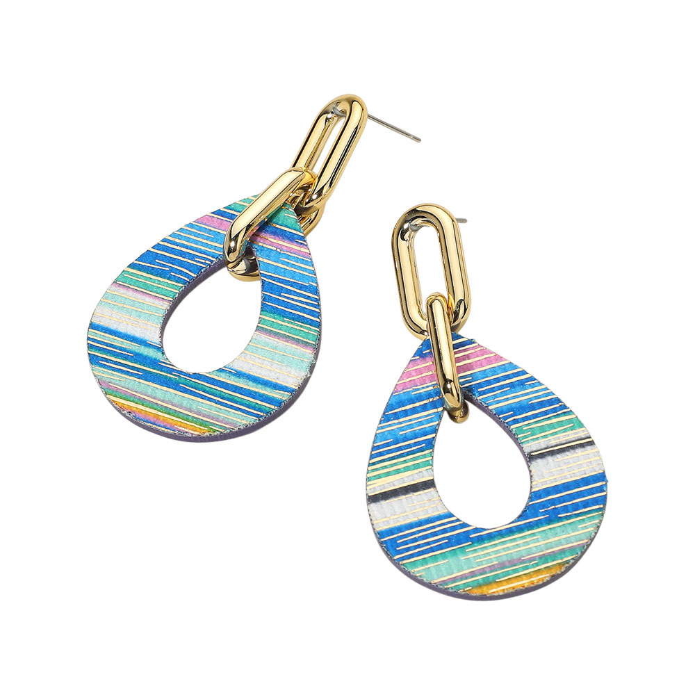 Details • Size : 1.3" X 2.4" • Post Back • These striped teardrop link dangle earrings feature a sleek teardrop design connected to bold metallic links. The vibrant striped finish adds a playful yet elegant flair, perfect for enhancing casual or evening looks with a touch of modern, eye-catching sophistication.