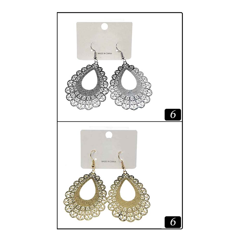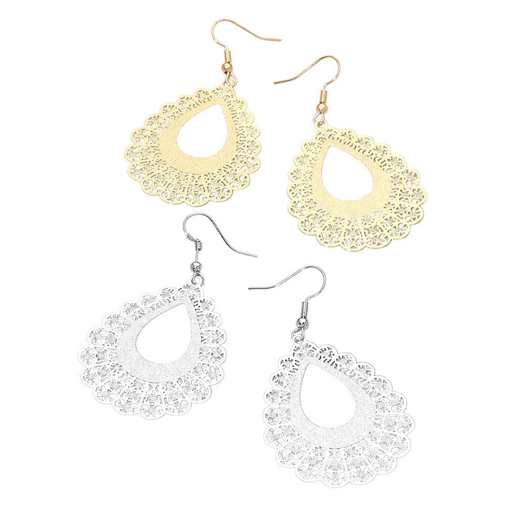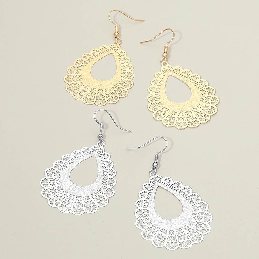 Details • Size : 1.4" X 2.4" • Fish Hook Back • Elegant teardrop drop earrings designed with intricate filigree openwork for a lightweight, refined look. Add graceful movement and statement detail to everyday outfits, vacations, and special occasions. Easy to wear and giftable, perfect for modern, boho, and romantic accessory styling.