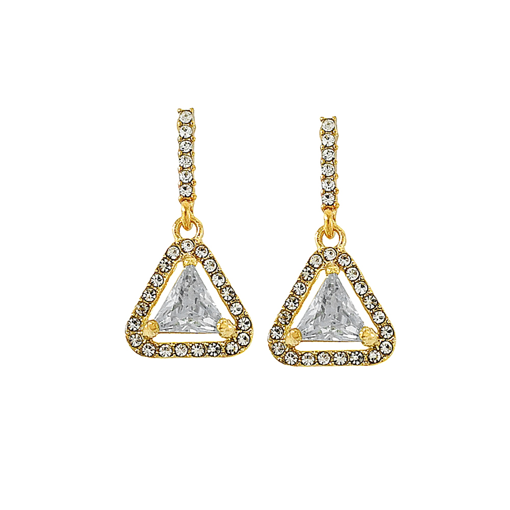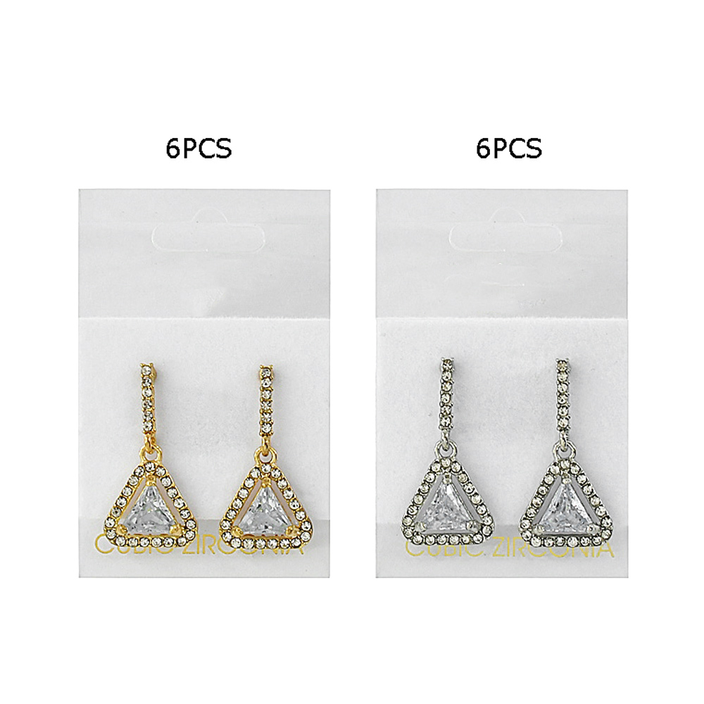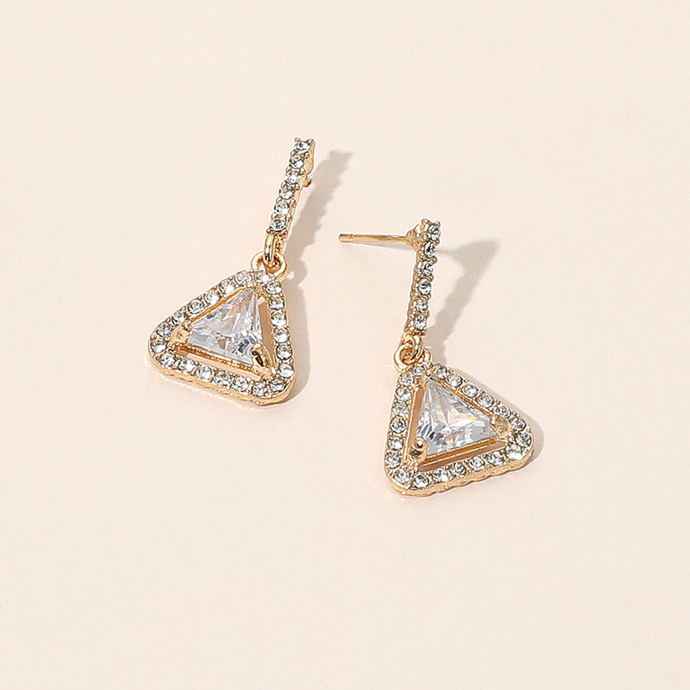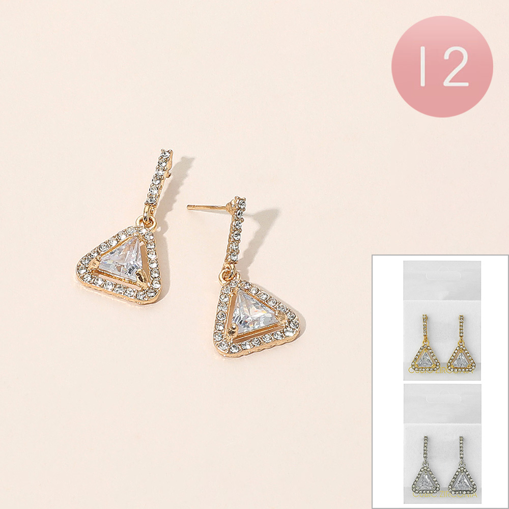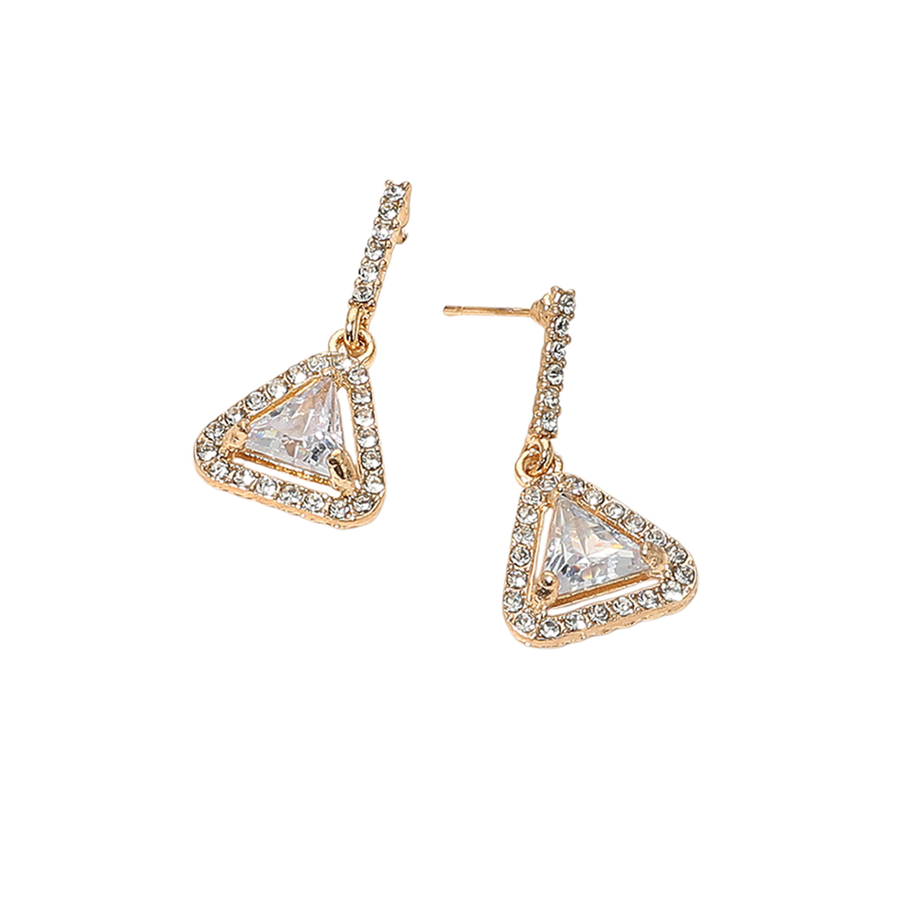 Details • Size : 0.7" X 1.25" • Post Back • Elevate your style with these chic triangle rhinestone drop earrings. Featuring a geometric design outlined with sparkling stones, these earrings are perfect for parties, formal occasions, or adding a modern glam touch to everyday outfits. A must-have statement accessory.