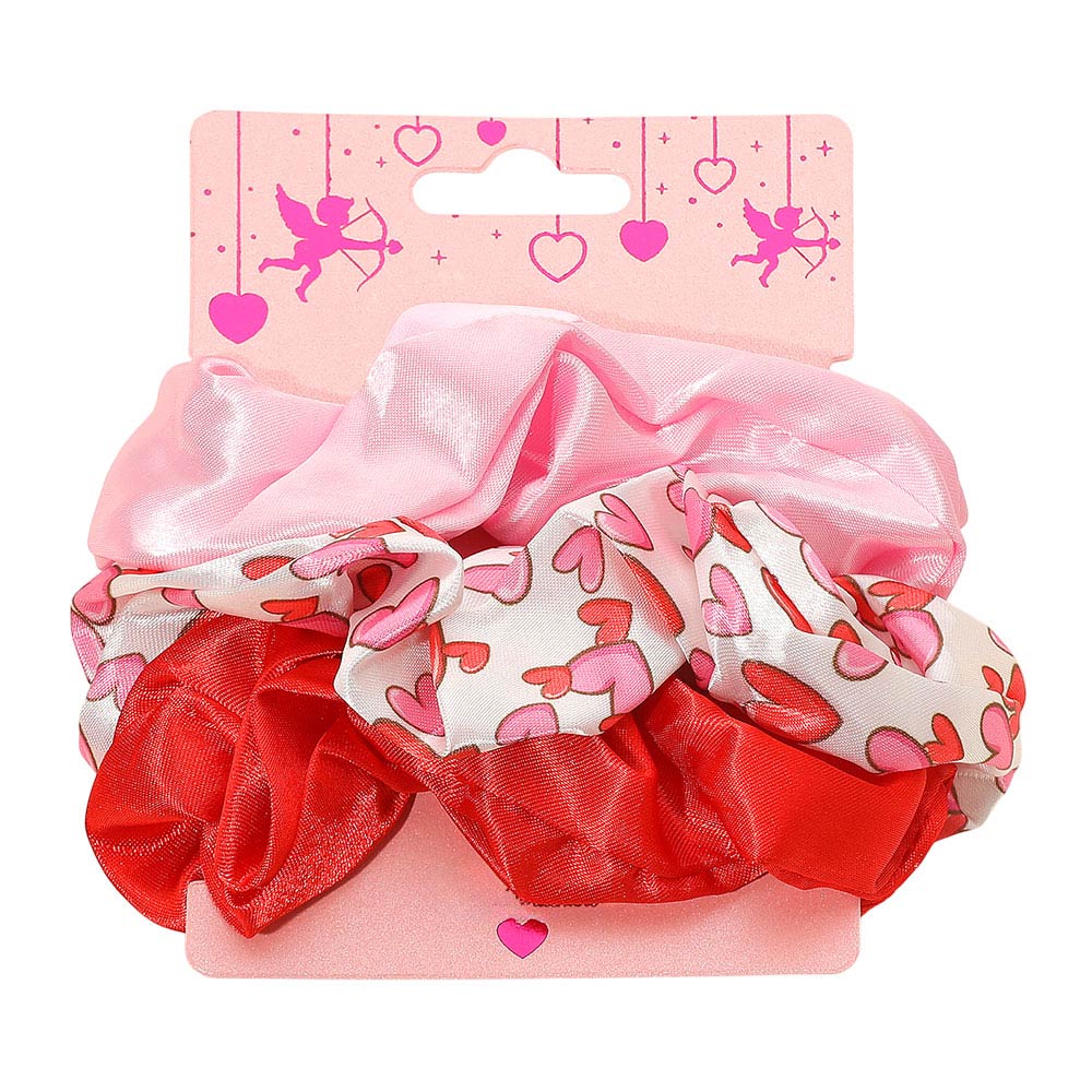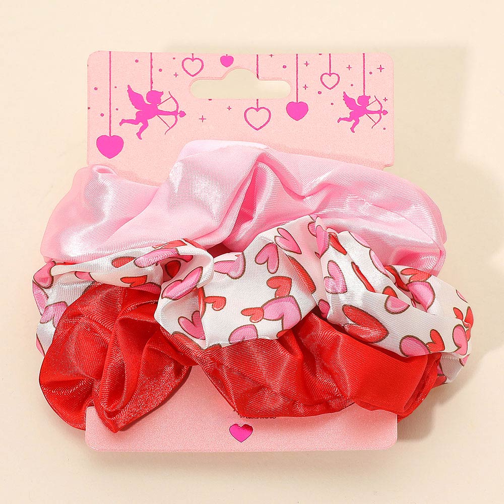 Details • Size : 2" H • Stretchable • This pack of 3 heart-print scrunchies adds a playful, romantic touch to everyday hairstyles. Designed with soft, smooth textures and gentle hold, they are ideal for ponytails, buns, or wrist accessories. Perfect for gifting, collecting, or styling with casual and festive looks.