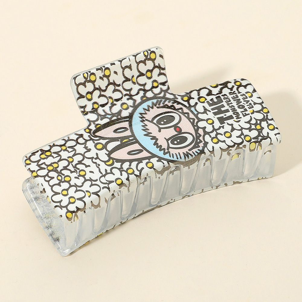 Details • Size : 3.3" X 1.7" • Adorable printed hair claw featuring playful character art and a daisy floral design. Strong grip keeps hair secure and stylish all day. Perfect for casual looks, school, or fun outings, this quirky accessory blends practicality with personality. A trendy must-have for kids, teens, and playful styles.