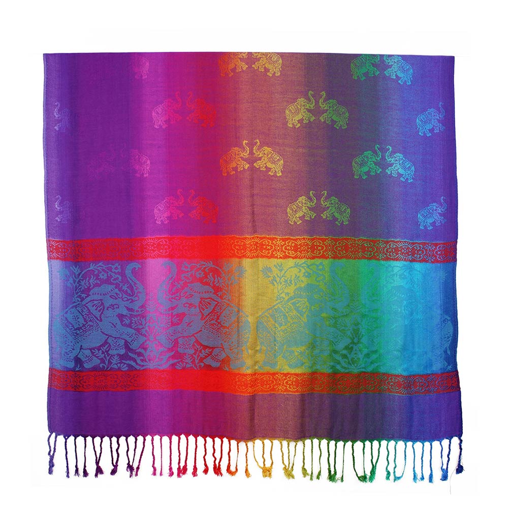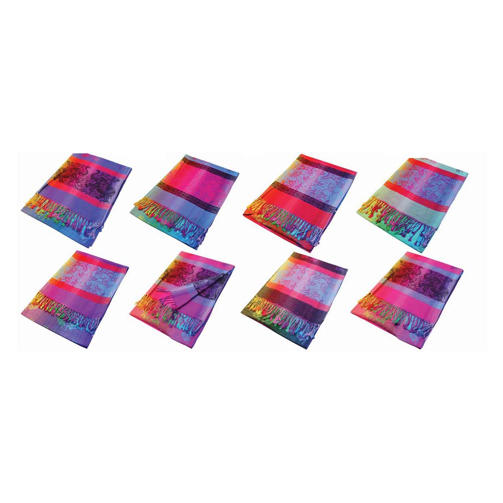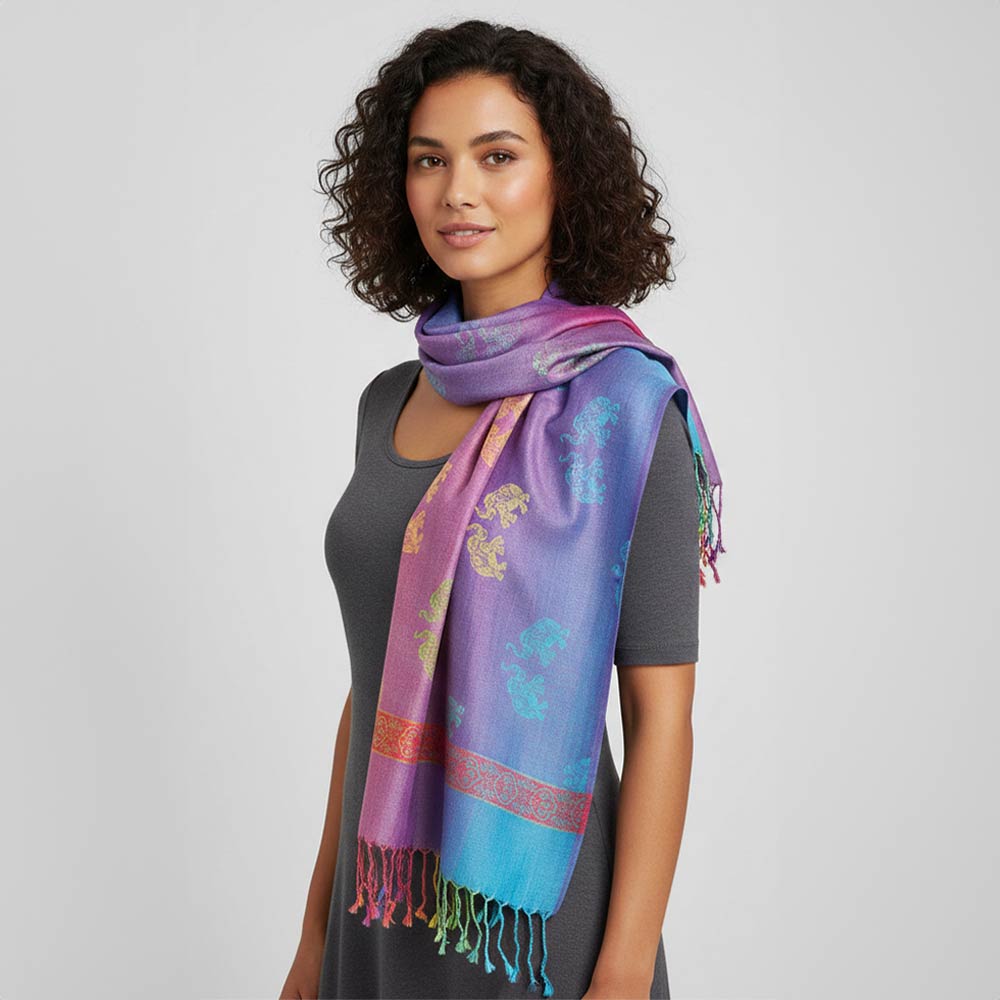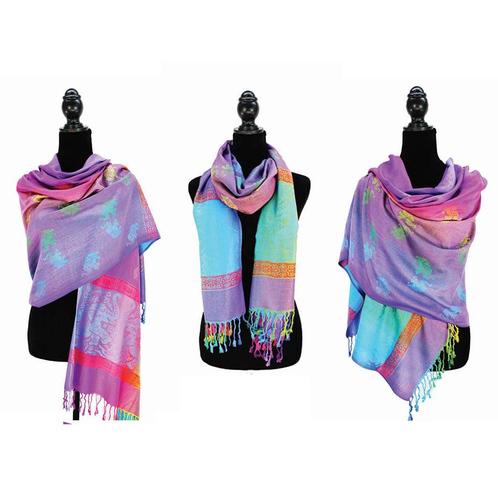 Details • Size : 27.5" X 76" • Fringe Size : 3.3" L • This fashion scarf features a decorative elephant motif with a refined border design and fringe finish for added movement. Designed for easy draping and versatile styling, it works well for everyday outfits, boutique displays, seasonal collections, and gift-focused accessory assortments.