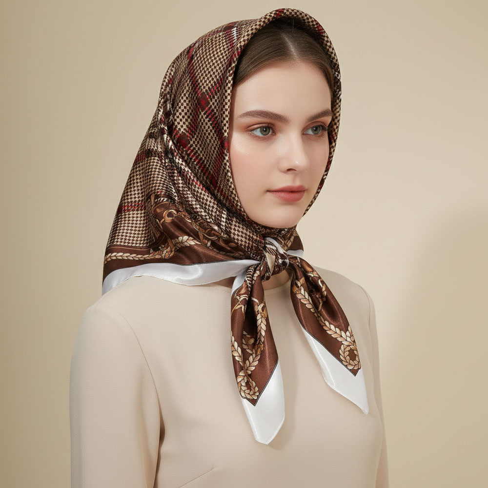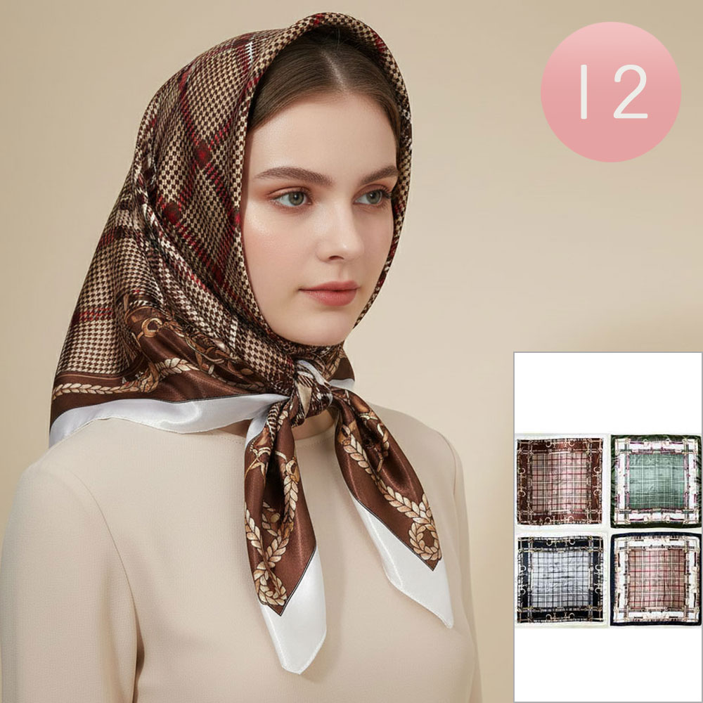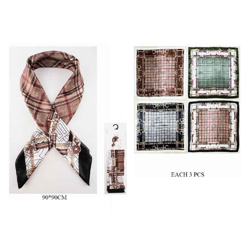 Details • Size : 36" X 36" • Material : 100% Polyester • Add timeless refinement to everyday outfits with this versatile square scarf featuring a refined check motif. Perfect for styling at the neck, hair, wrist, or bag, it offers effortless elegance for casual wear or elevated looks.