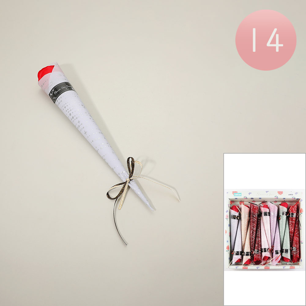 Details • Size : 2" X 1.3" • Elegant 14-pack rose soap gift cones wrapped with a decorative ribbon. Each cone holds a beautifully crafted rose-shaped soap, perfect for romantic gifts, weddings, or spa favors. Adds a charming touch to any occasion while offering a fragrant and luxurious experience.