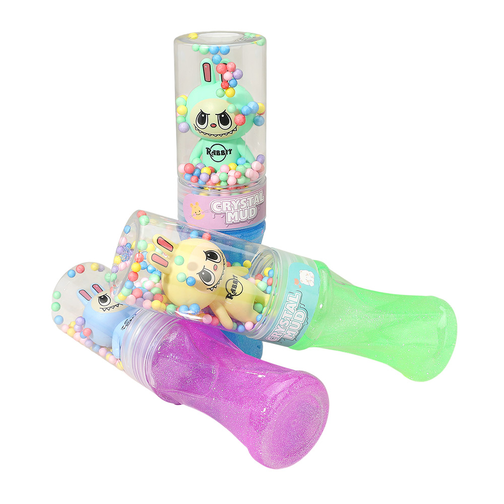 Details • Size : 7.5" L • Crystal mud slime toy set featuring cute bunny character containers filled with glitter slime and foam beads. Stretchy, soft, and fun to squish, perfect for sensory play, party favors, or stress relief. A playful and colorful way for kids to enjoy creative hands-on entertainment.