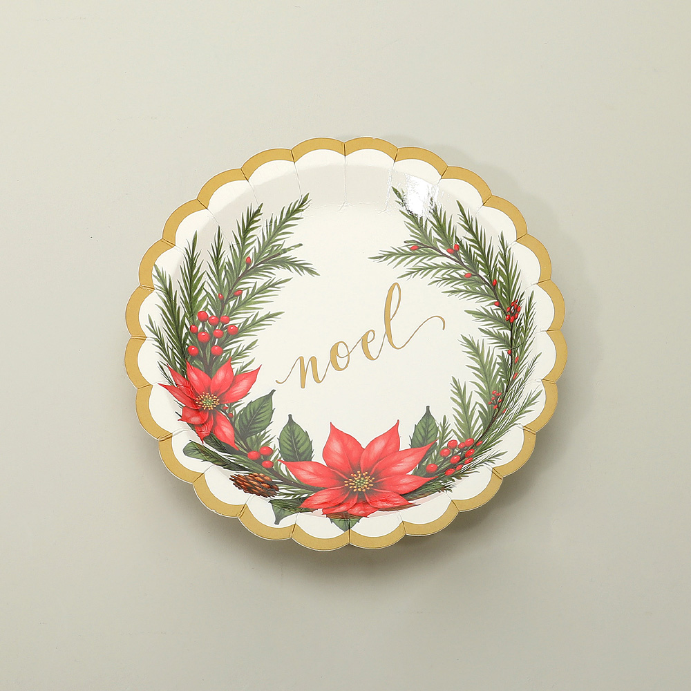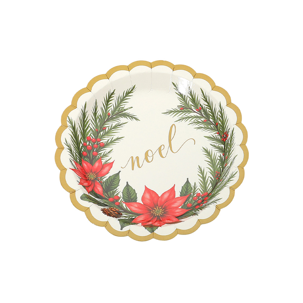 Details • Size : 7" X 7" • Serve your holiday treats with festive charm using these Noel paper plates featuring a wreath and poinsettia design with scalloped edges. Perfect for Christmas parties, dinners, and seasonal gatherings, this 16-pack combines elegance with easy entertaining.