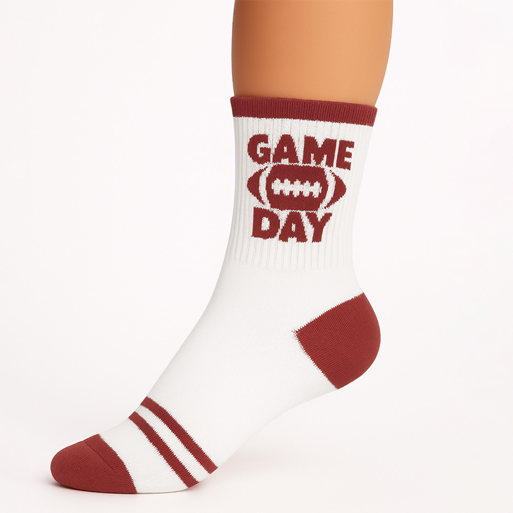 • Step up your team spirit with these gameday crew socks featuring a bold football and “Game Day” design. Perfect for tailgates, sports events, or casual wear, this 10-pack offers comfort and style, making them an essential accessory for every dedicated sports fan.