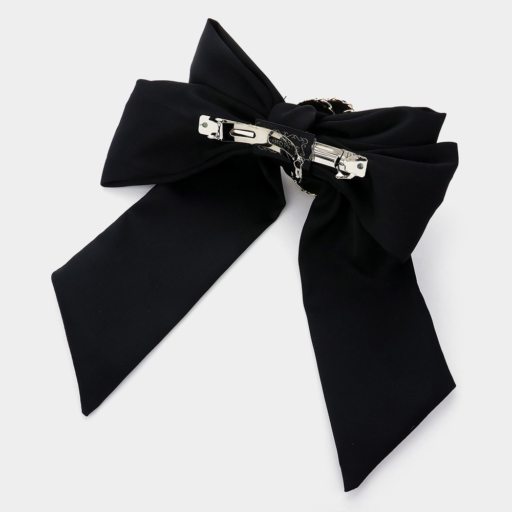 Pearl Pointed Faux Leather Braided Flower Center Oversized Bow Barrette