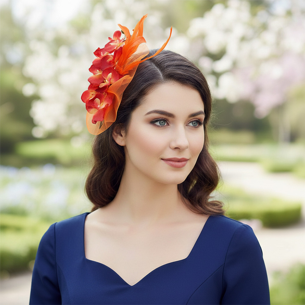 • Elegant fascinator headpiece featuring floral detailing and feather accents, perfect for weddings, garden parties, or race day events. Designed to sit gracefully, this accessory adds a refined touch to dressy outfits with elegance and charm.