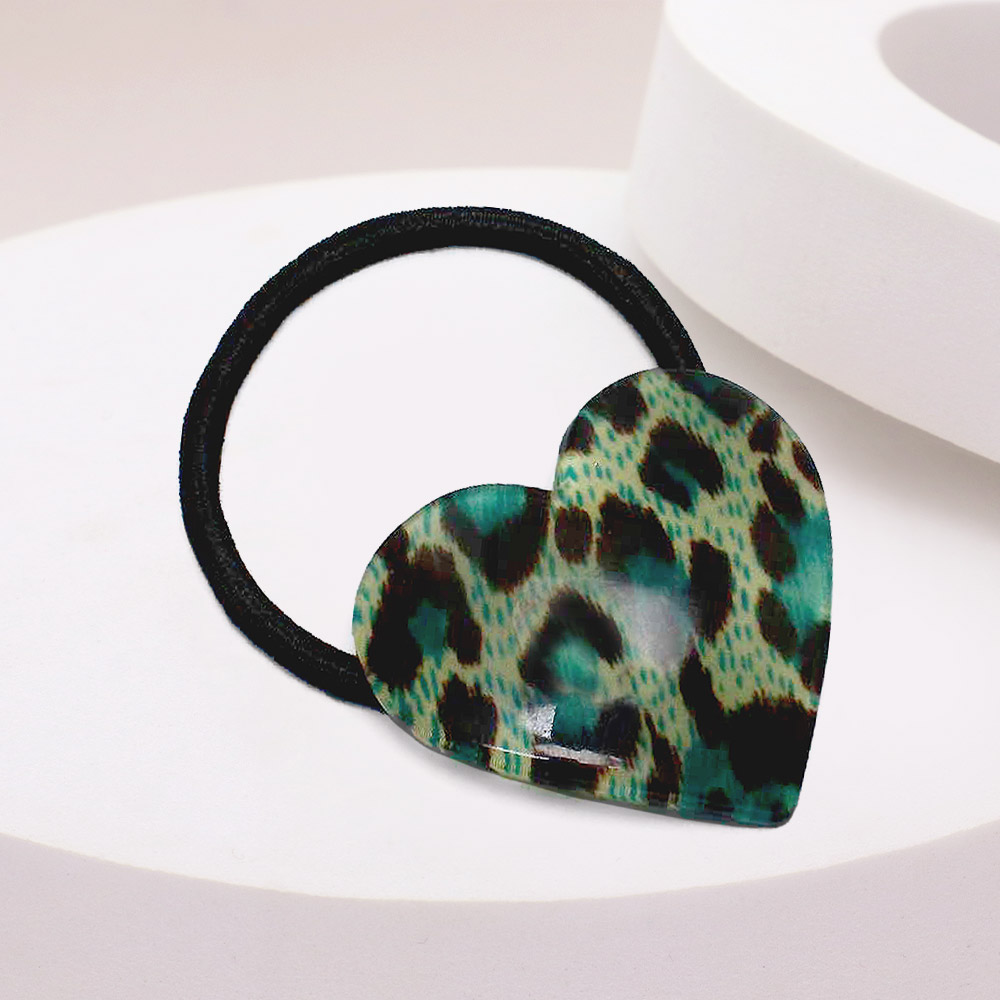 • Trendy hair tie featuring a chic leopard print heart charm on a strong elastic band. Perfect for securing ponytails or adding a fashionable accent to any hairstyle.