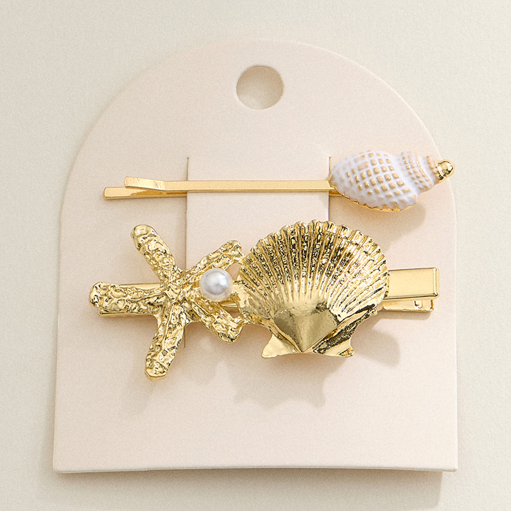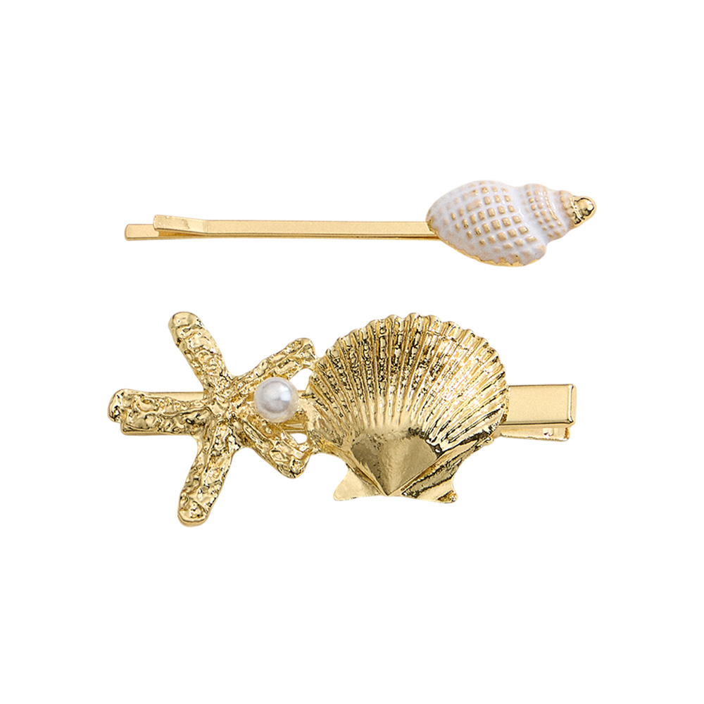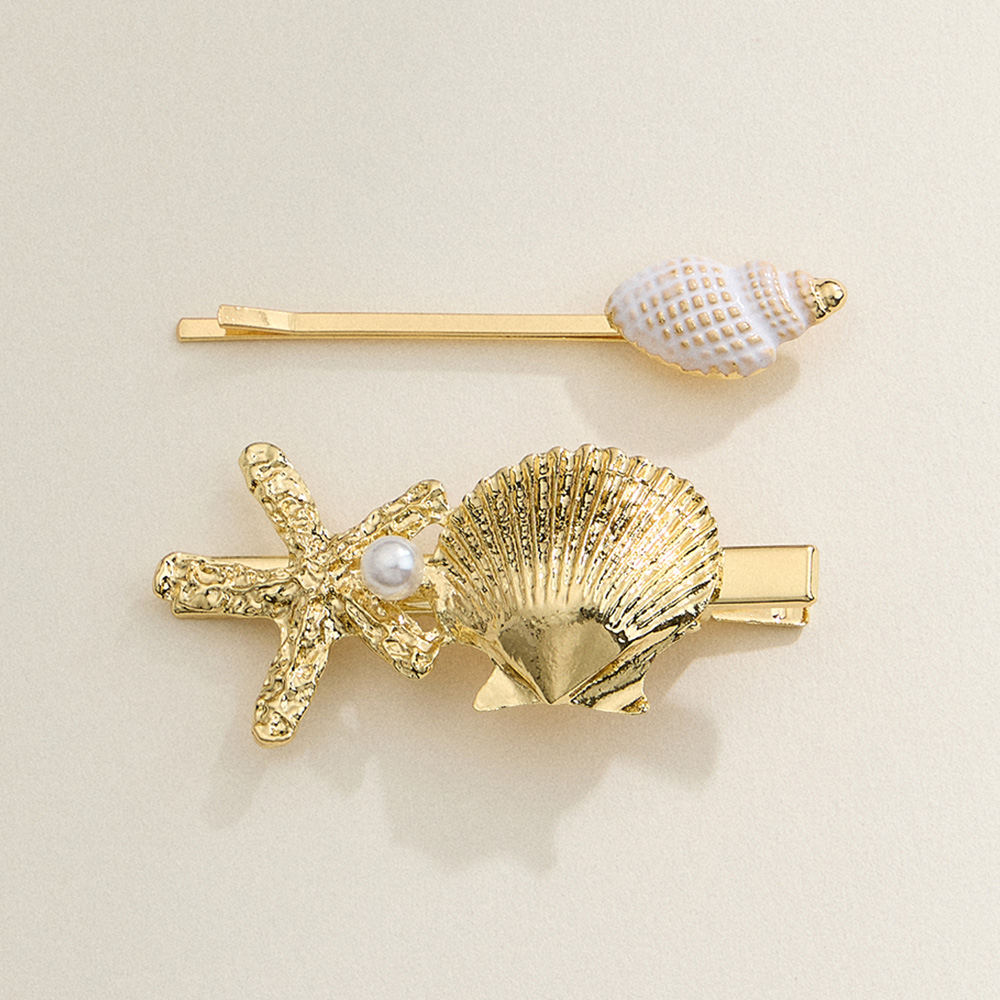 2PCS - Conch Shell Pointed Bobbi Pin Textured Metal Starfish Sea Shell Pearl Pointed Alligator Snap Hair Clips