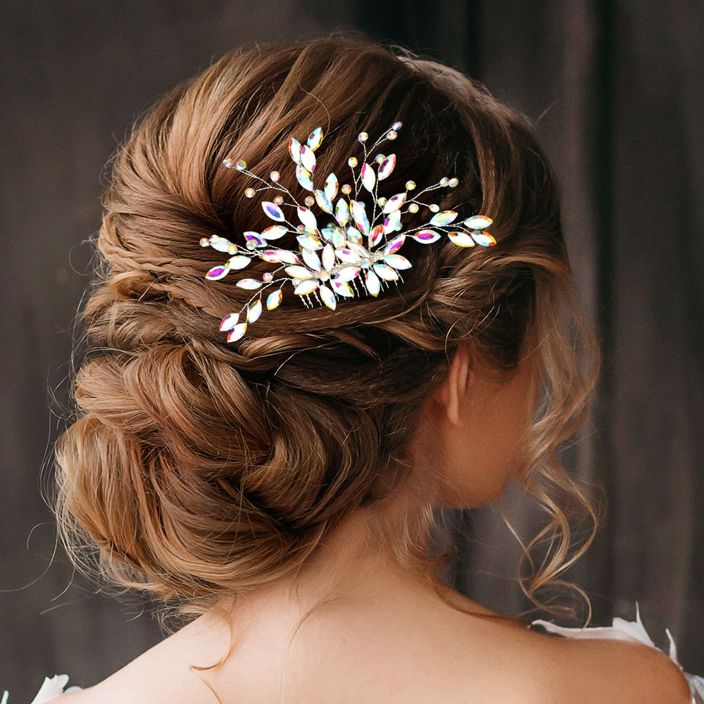 • This bridal crystal leaf hair comb adds radiant sparkle and refined elegance to any hairstyle. Designed with delicate leaf motifs and shimmering stones, it’s perfect for weddings, receptions, and formal events. A timeless accessory that enhances your bridal look with graceful charm.