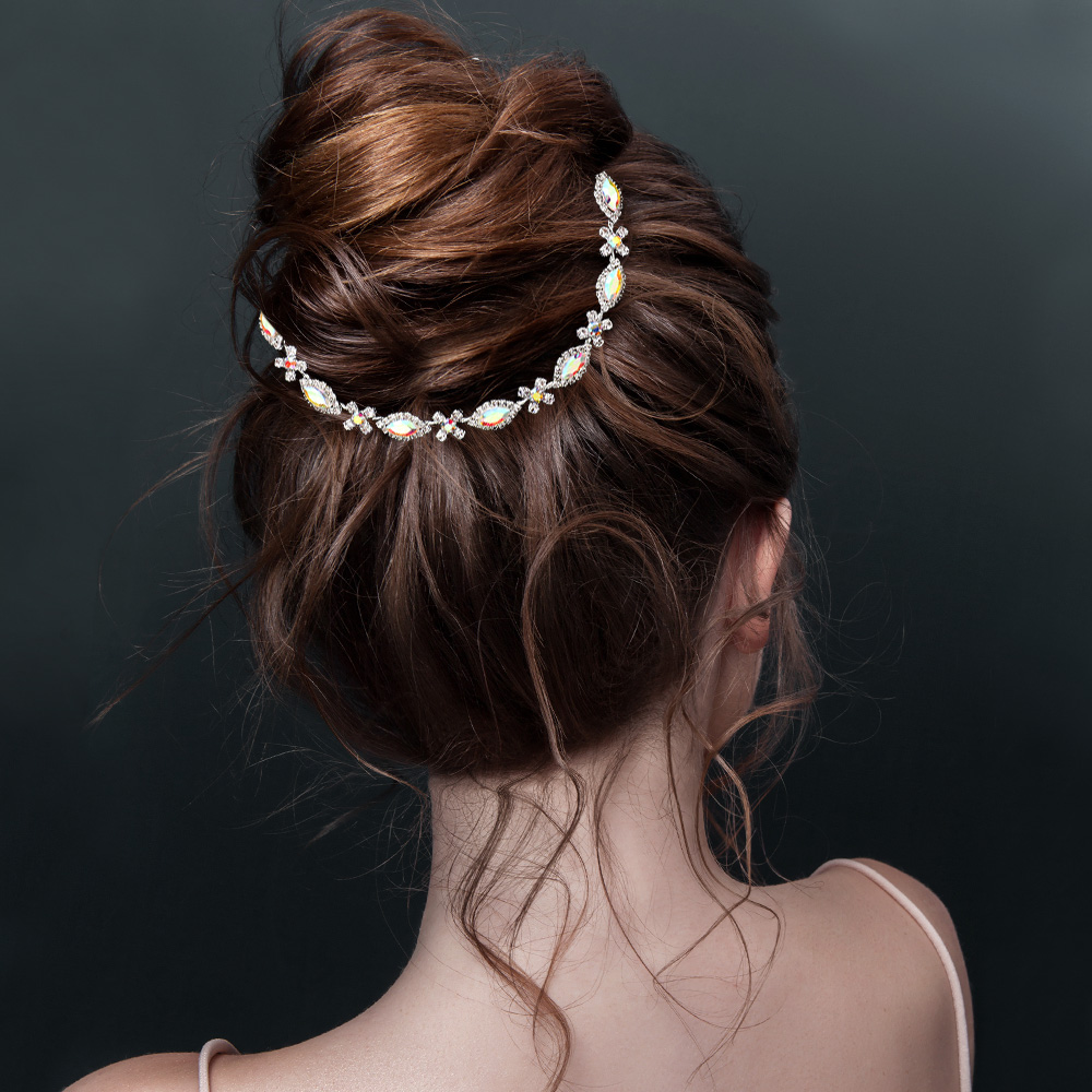 Details • Size : 11" X 0.3" • A Pair Bobby Pin and Sash Ribbon Included • Graceful arc-shaped hair clip with crystal accents, perfect for bridal updos or elegant evening styles. Adds delicate sparkle and a refined finish to any formal hairstyle or special occasion look.