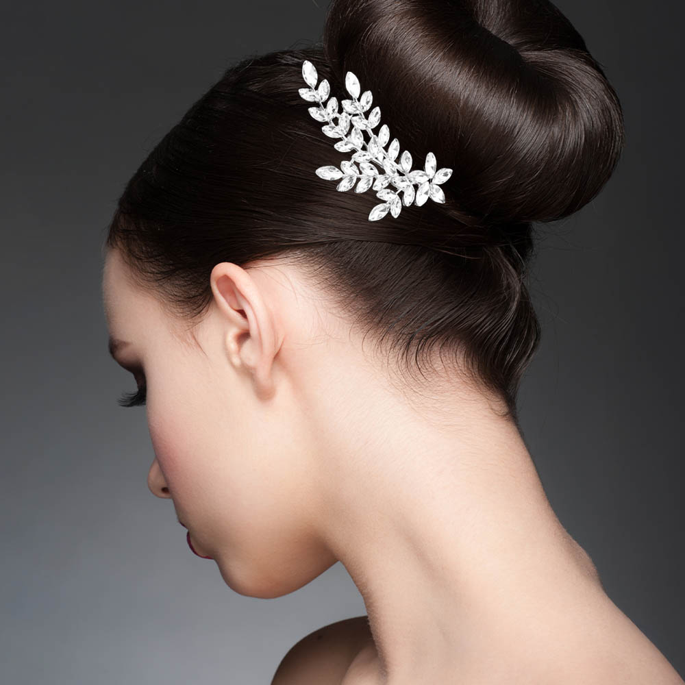 • Add a touch of nature-inspired beauty with this elegant crystal leaf hair comb. Featuring marquise-cut stones arranged in a graceful branch design, it sparkles effortlessly in any hairstyle. Perfect for weddings, parties, or special occasions, it enhances your look with refined elegance.