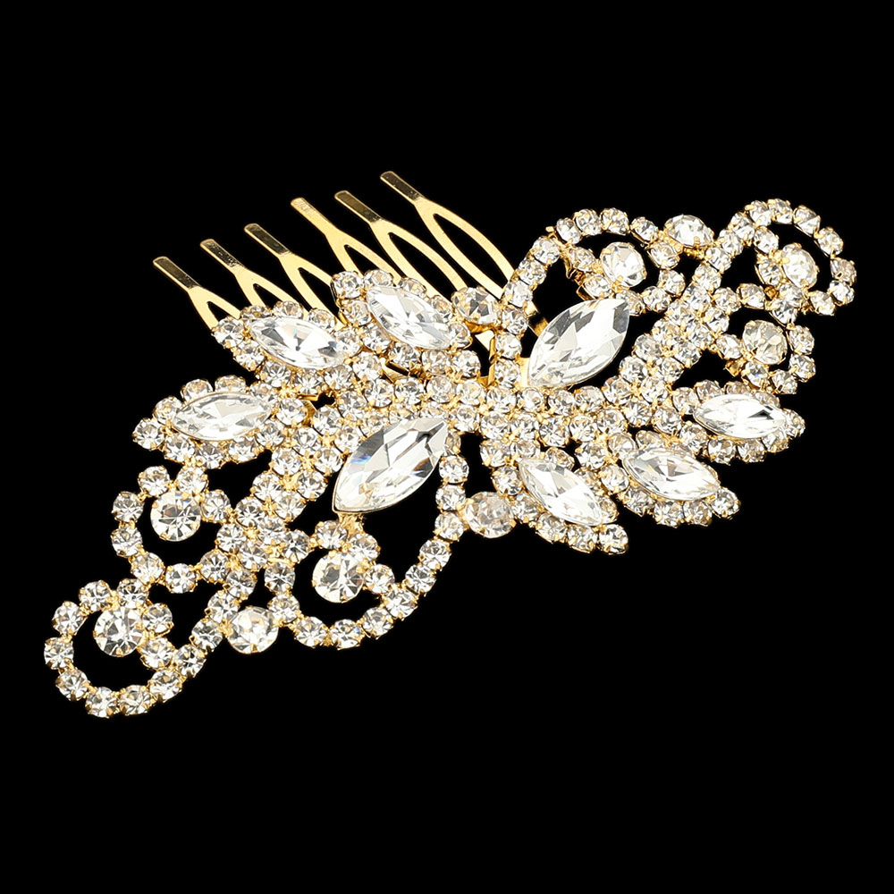 • Rhinestone leaf bridal hair comb with marquise and round crystals in a delicate floral design. Perfect for weddings, proms, and formal occasions, this sparkling accessory enhances elegant updos with timeless charm.