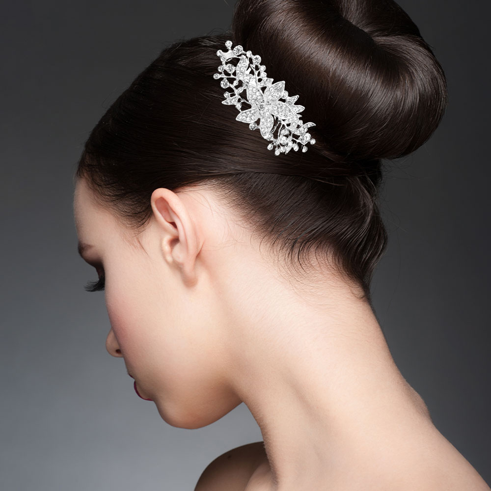 Details • Size : 3" X 1.4" • Enhance your hairstyle with this sparkling floral crystal hair comb, crafted to add a touch of glamour and grace. Featuring dazzling crystal blossoms and delicate detailing, it’s perfect for weddings, parties, or elegant occasions, offering a timeless accent that shines beautifully. • Lead and Nickel Compliant