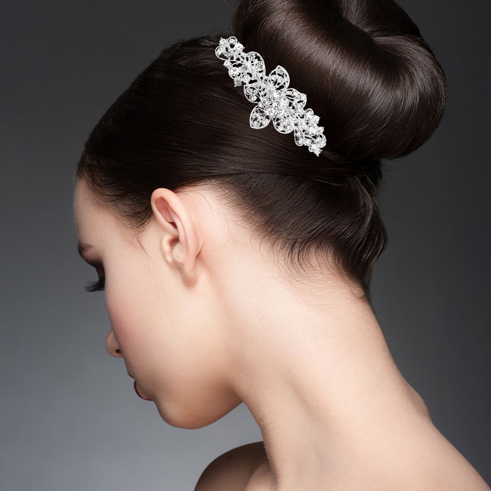Details • Size : 3.5" X 1.5" • This vintage crystal filigree hair comb combines timeless charm with radiant sparkle. Intricately designed with floral motifs and shimmering stones, it’s ideal for weddings, formal events, or special occasions. A beautifully detailed accessory that adds elegance and sophistication to any hairstyle.