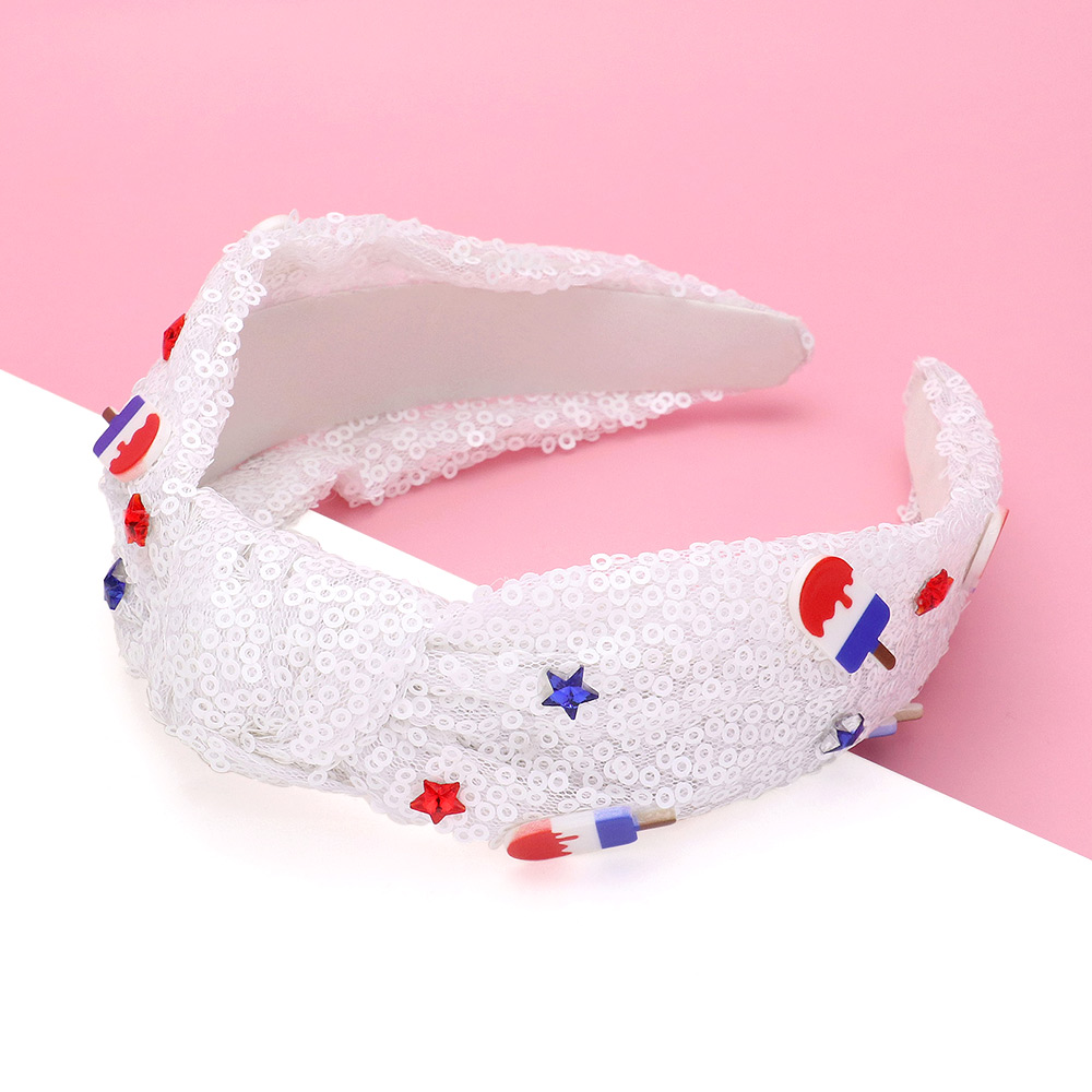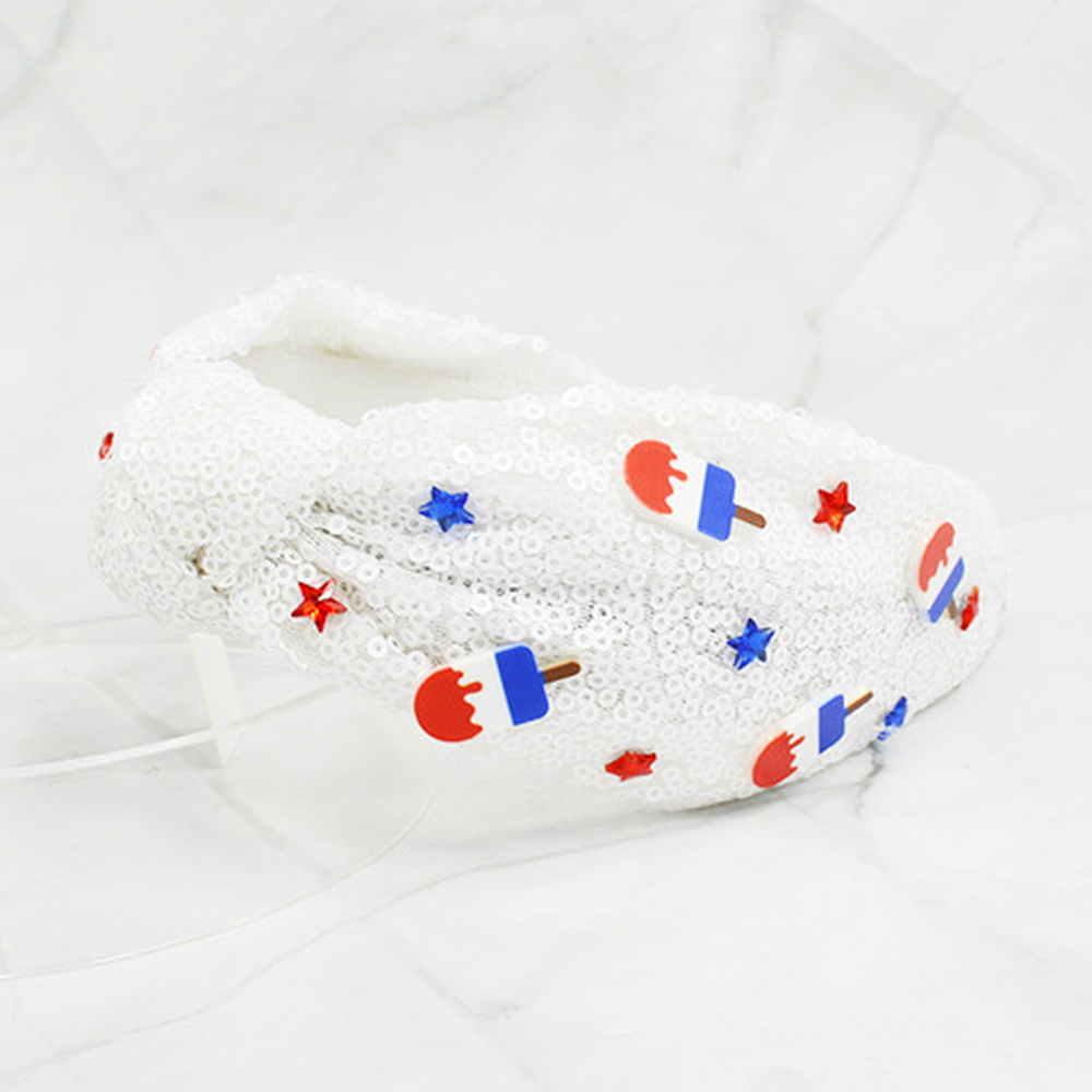 American USA Flag Theme Resin Star Popsicle Embellished Sequin Knot Headband