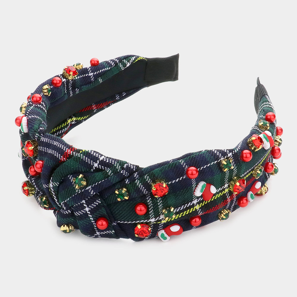 • Festive knotted headbands featuring classic plaid fabric adorned with colorful beads and holiday-themed embellishments. A cheerful accessory to add sparkle and charm to seasonal outfits.