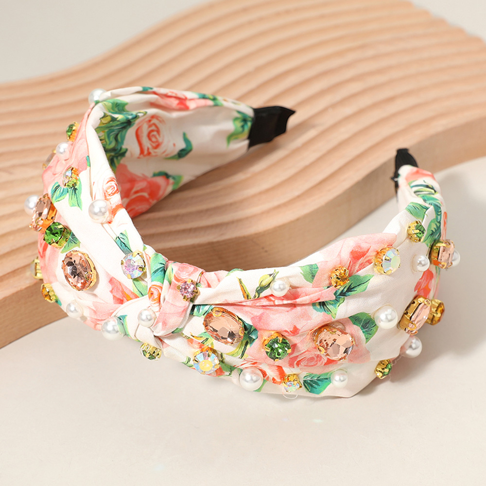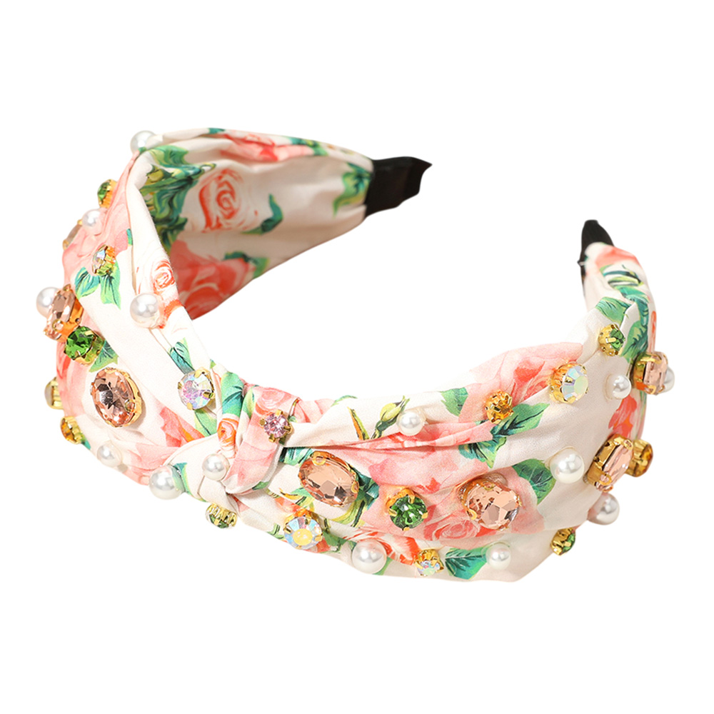 Stone Cluster Pearl Embellished Flower Printed Knot Headband