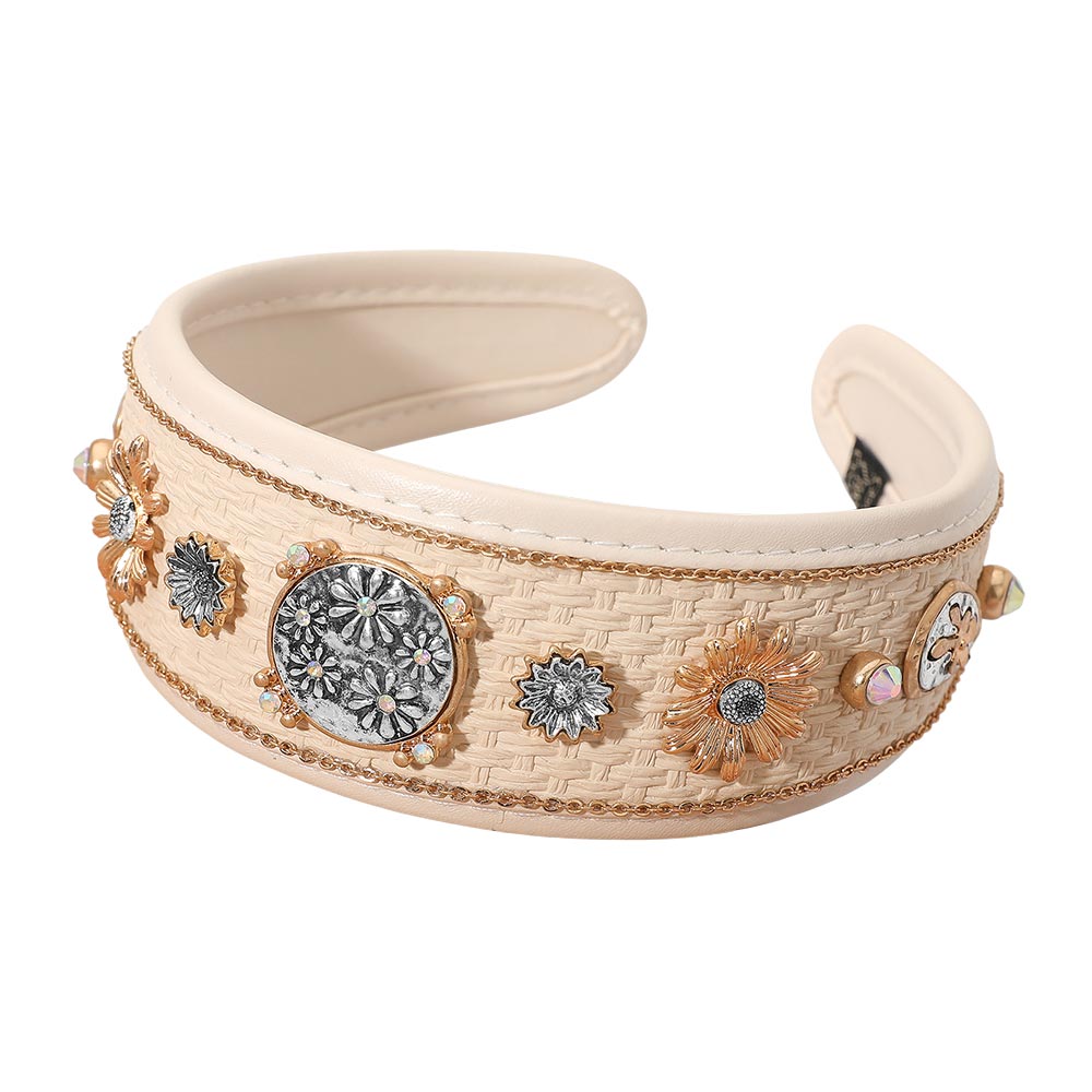 • Elegant woven headband featuring floral concho details with metallic and crystal-style accents. The intricate mix of gold and silver embellishments creates a refined western flair, making it a standout accessory for boho-chic or rustic-inspired looks.