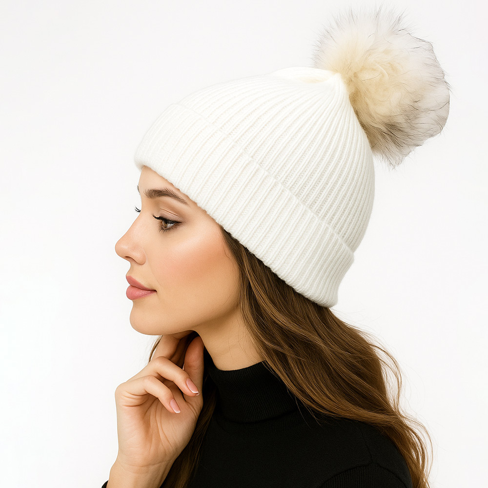 Genuine Fox Fur Pom Pom Ribbed Knit Winter Beanie Hat