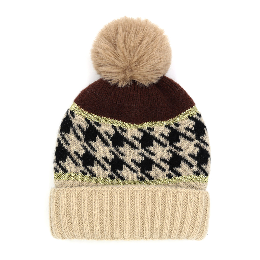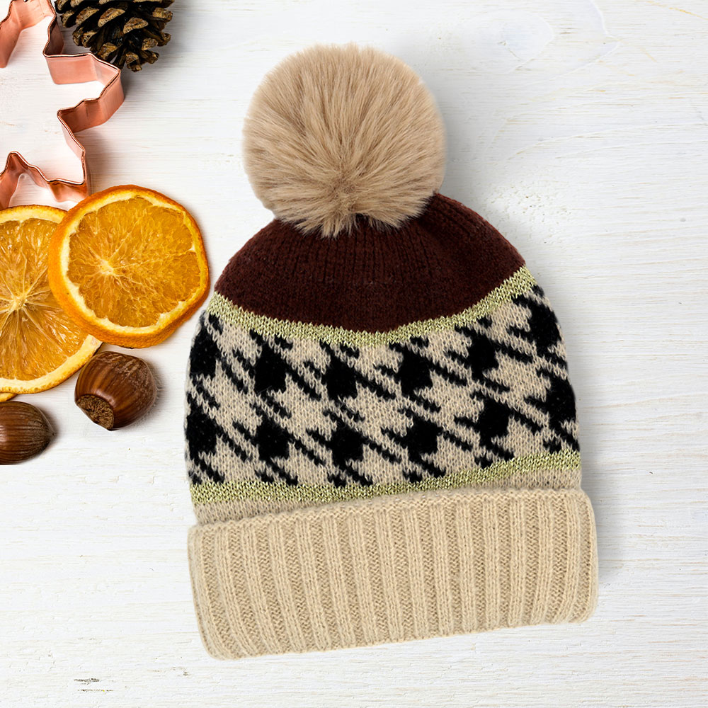 Zigzag Chevron Patterned Fuzzy Fleece Pom Pom Beanie Hat