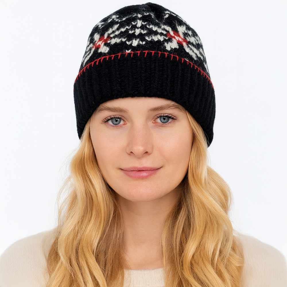 Details • Size : 9.8" X 9.4" • Material : 100% Acrylic • Stay cozy in style with this Fair Isle knit beanie, featuring a timeless winter pattern and ribbed fold-over brim for a snug fit. Perfect for cold-weather outings, skiing, or casual wear, this versatile hat combines warmth and comfort with a classic design that never goes out of style.