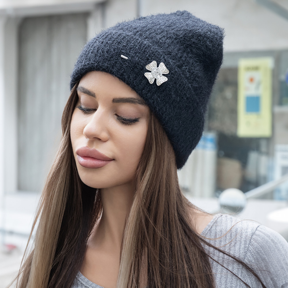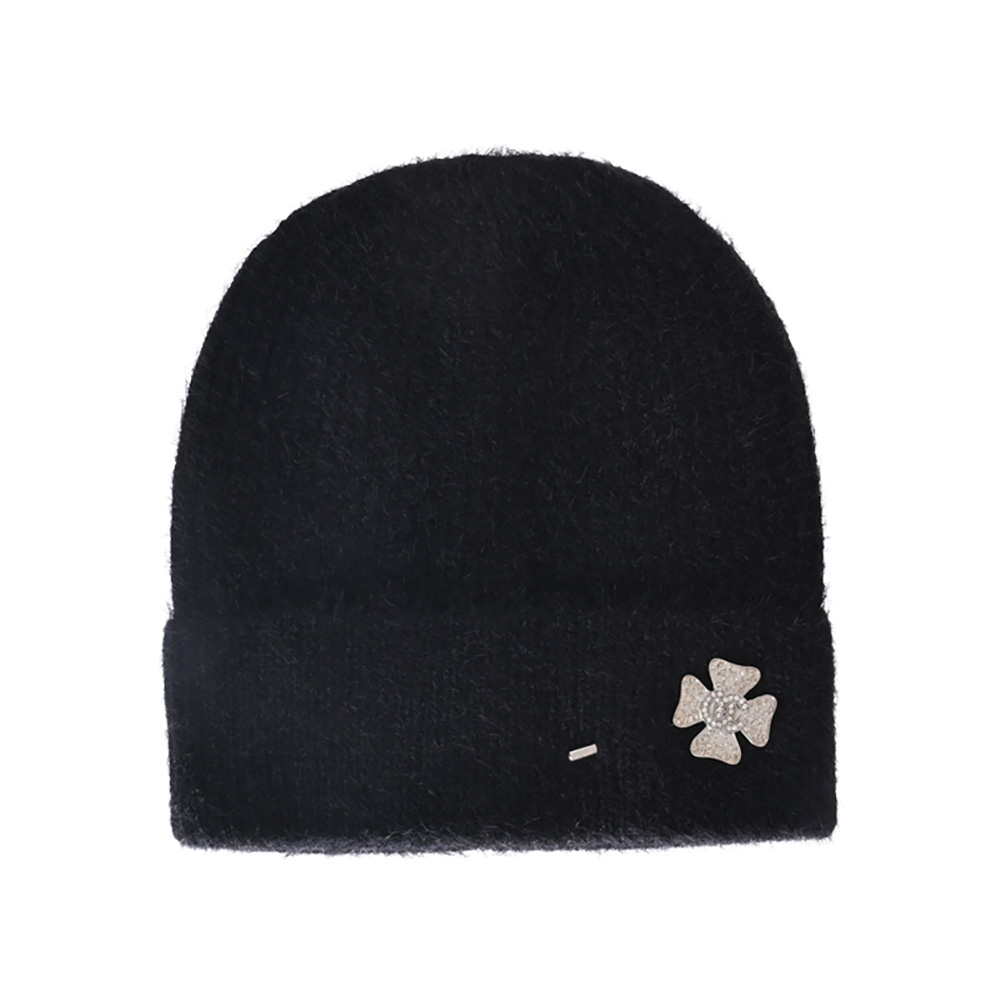 Stone Paved Clover Lapel Pin Brooch Accented Fuzzy Beanie Hat