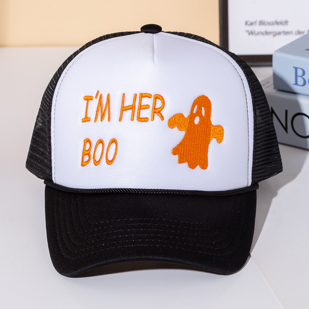 • Halloween trucker cap with embroidered “I’M HER BOO” and ghost design, perfect for spooky season fun. Lightweight with breathable mesh back, this adjustable novelty hat makes a festive couple’s accessory, party gift, or casual statement piece for October outfits, trick-or-treating, or themed events.