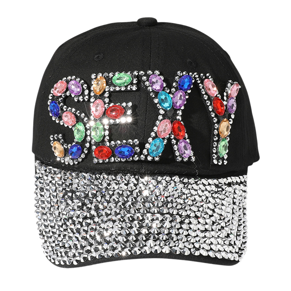Details • Crown Circumference : 23" (Adjustable) • Crown Height : 4.5" • Brim Height : 3.5" • Material : 100% Cotton • Multicolor gemstones create a standout lettering • Fully embellished Brim - covered in shimmering silver rhinestone for maximum sparkle • Eye-catching cap with bold SEXY lettering in colorful rhinestones and a fully studded brim. A glam accessory that adds sparkle and confidence to your casual or party outfit.
