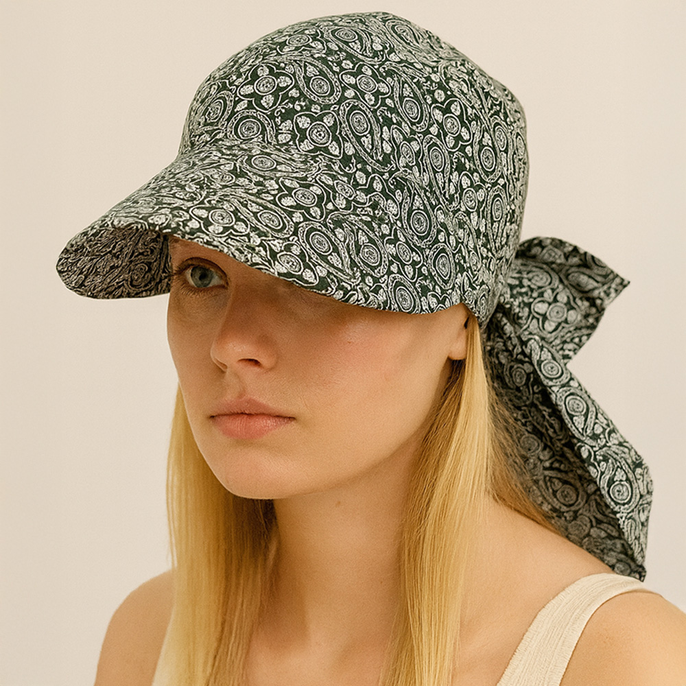 Details • Size : 35.4" X 18.5" • Material : 100% Cotton • Add a touch of timeless style with this paisley print bow-back cap, featuring a curved brim for sun protection and a statement bow detail at the back. Lightweight and versatile, it’s the perfect accessory for casual outings, travel, or elevating your everyday look.