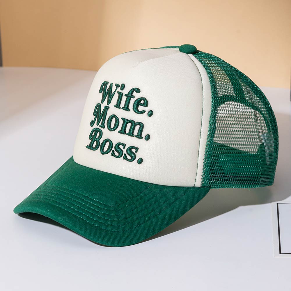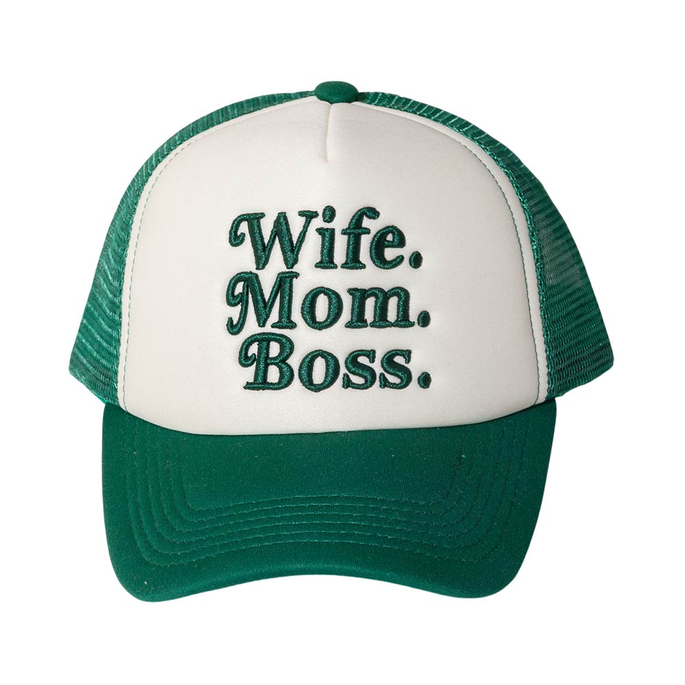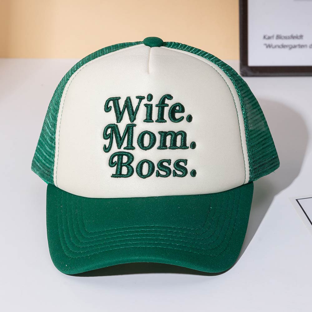 Details • Size : One Size • Confident statement trucker hat featuring “Wife. Mom. Boss.” embroidery for everyday wear. Designed for a comfortable fit with breathable construction and easy styling. Perfect for errands, travel, casual outings, or gifting with an empowering message that celebrates modern life roles.