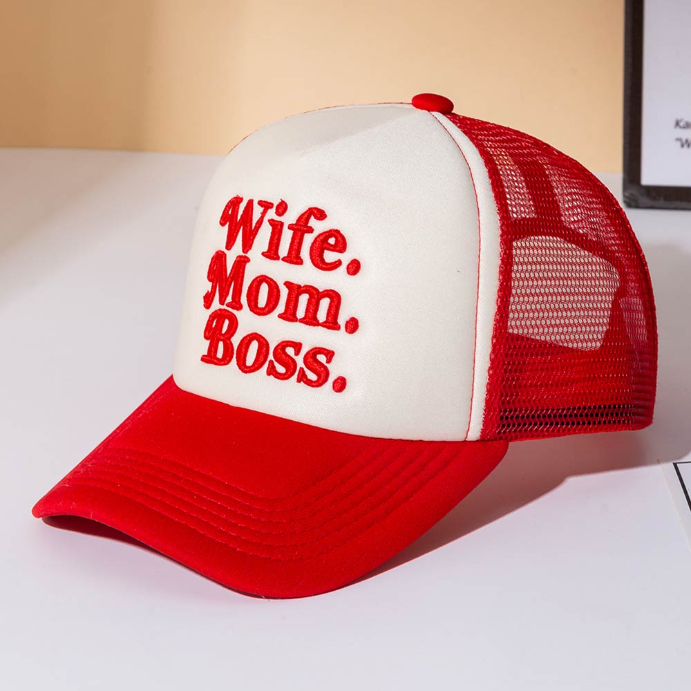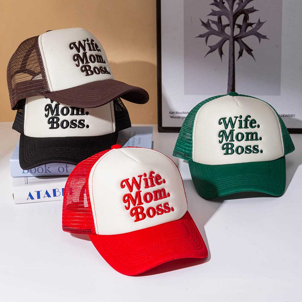 Details • Size : One Size • Confident statement trucker hat featuring “Wife. Mom. Boss.” embroidery for everyday wear. Designed for a comfortable fit with breathable construction and easy styling. Perfect for errands, travel, casual outings, or gifting with an empowering message that celebrates modern life roles.
