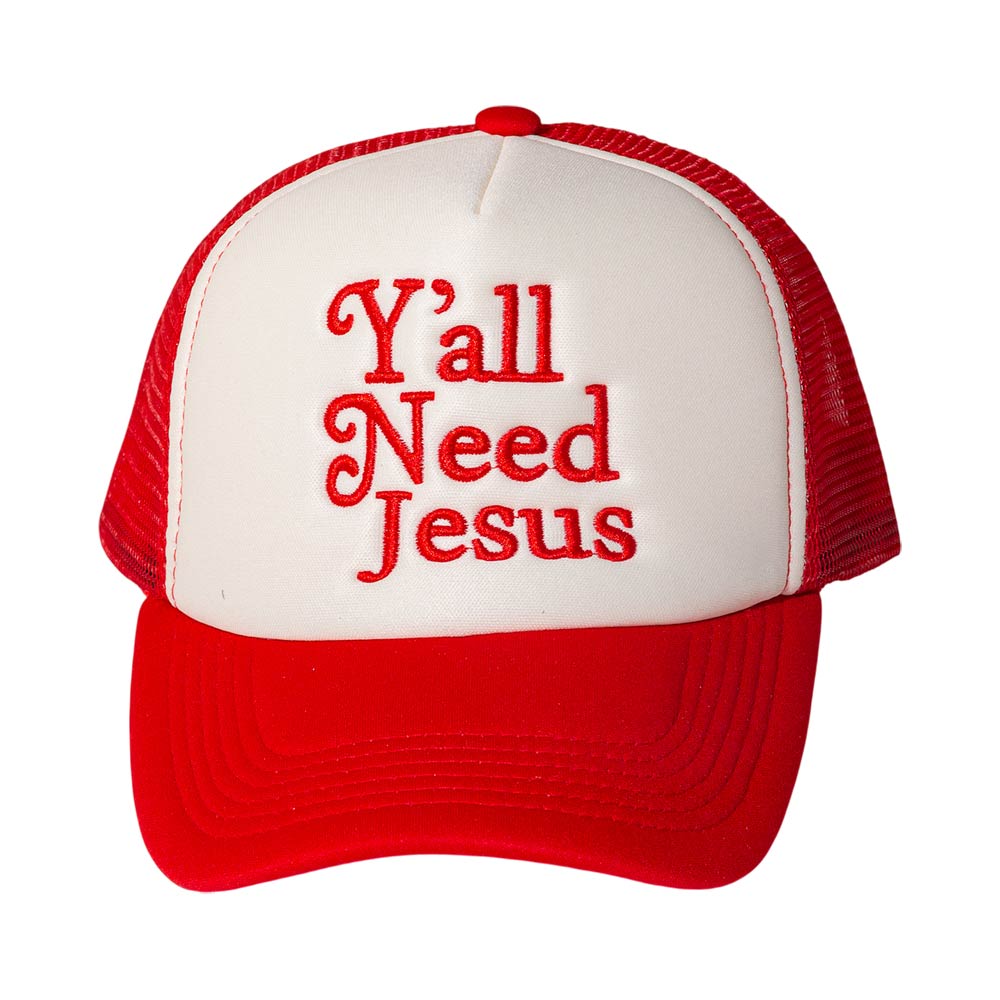 Details • Size : One Size • Bold statement trucker hat featuring “Y’all Need Jesus” embroidery for expressive everyday wear. Designed for a comfortable fit and breathable style, perfect for casual outfits, road trips, outdoor activities, or gifting with a confident message and standout personality.