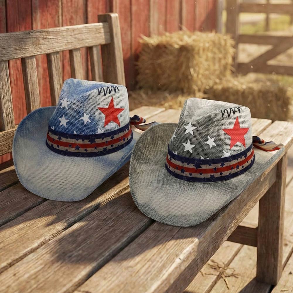 • Bold western cowboy hat featuring an allover star pattern and striped accent band for a patriotic statement look. Designed with a structured crown and curved brim, this eye-catching hat is perfect for festivals, holidays, concerts, rodeos, and standout western-inspired outfits.
