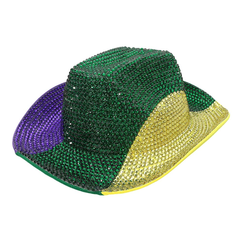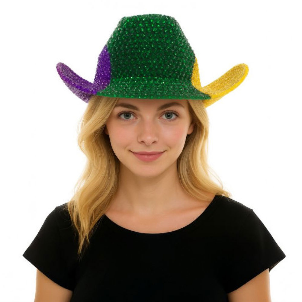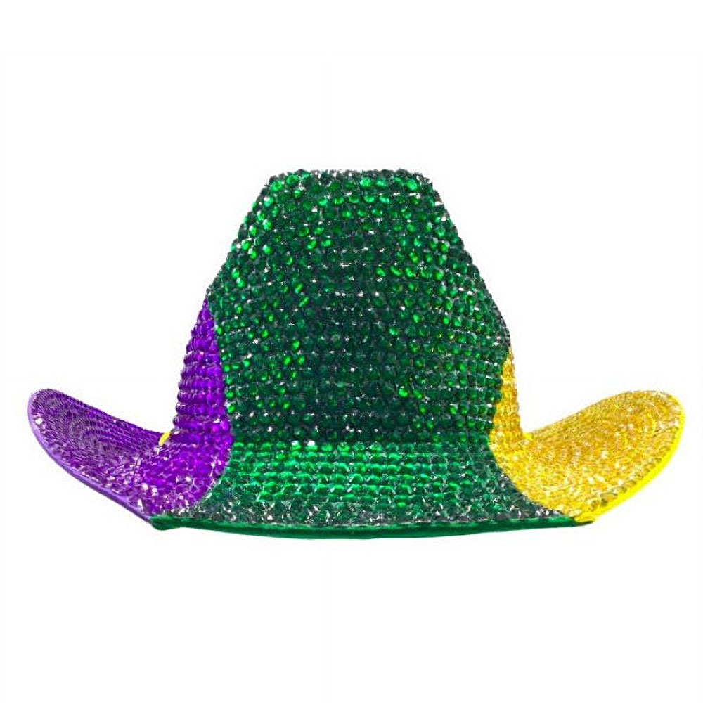 Details • Crown Circumference : 23" • Crown Height : 4.25" • Brim Height : 3" • Eye-catching bling studded cowboy hat designed to stand out at parades, parties, and themed celebrations. Features a bold western silhouette with shimmering texture that adds playful personality to costumes, group events, photo moments, and festive styling.