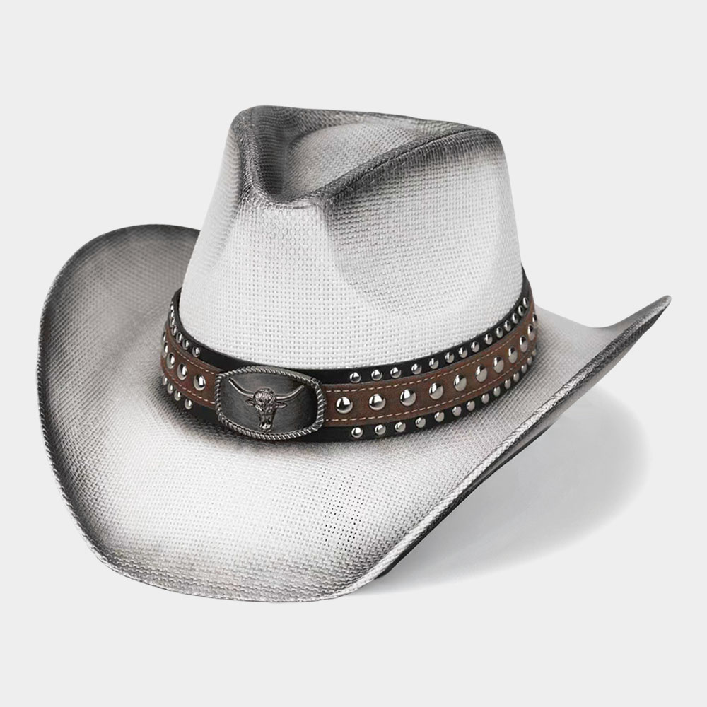 Boho Oval Steer Head Buckle Studded Faux Leather Band Straw Western Cowboy Hat