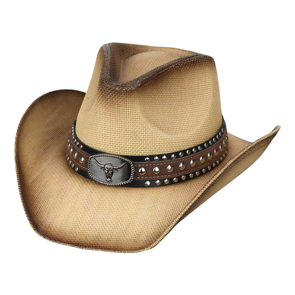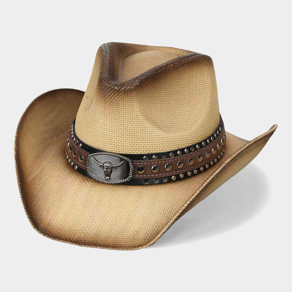 Details • Crown Circumference: 23" • Crown Height : 5.5" • Brim Width : 3.5" • Material : 100% Straw • Bold western-inspired cowboy hat featuring a structured silhouette and a stud-accented band with oval steer head buckle detail. Designed to elevate festival looks, themed collections, and statement outfits, this hat adds rugged character and standout style to any accessory assortment.