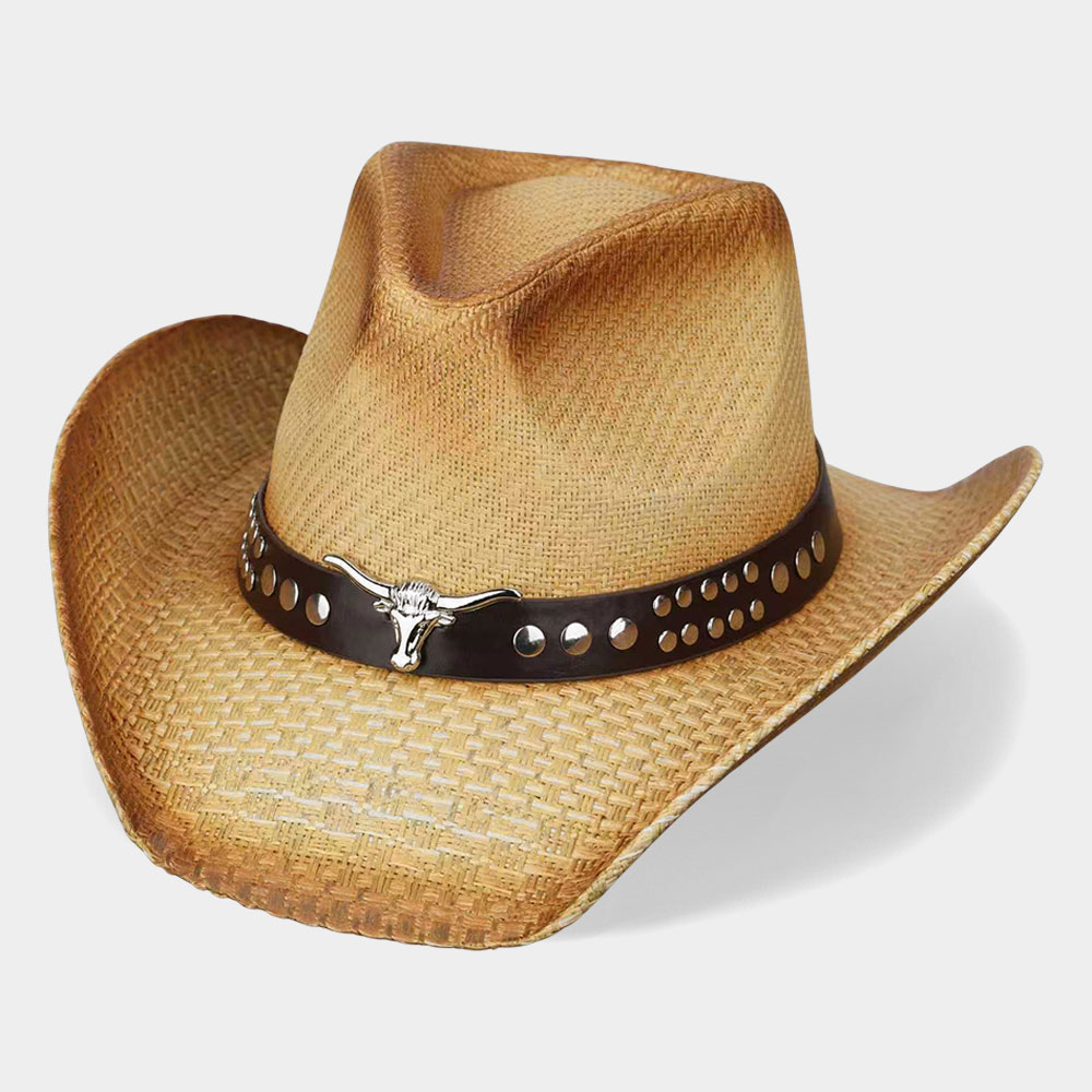 Boho Steer Head Accent Studded Faux Leather Band Woven Straw Western Cowboy Hat