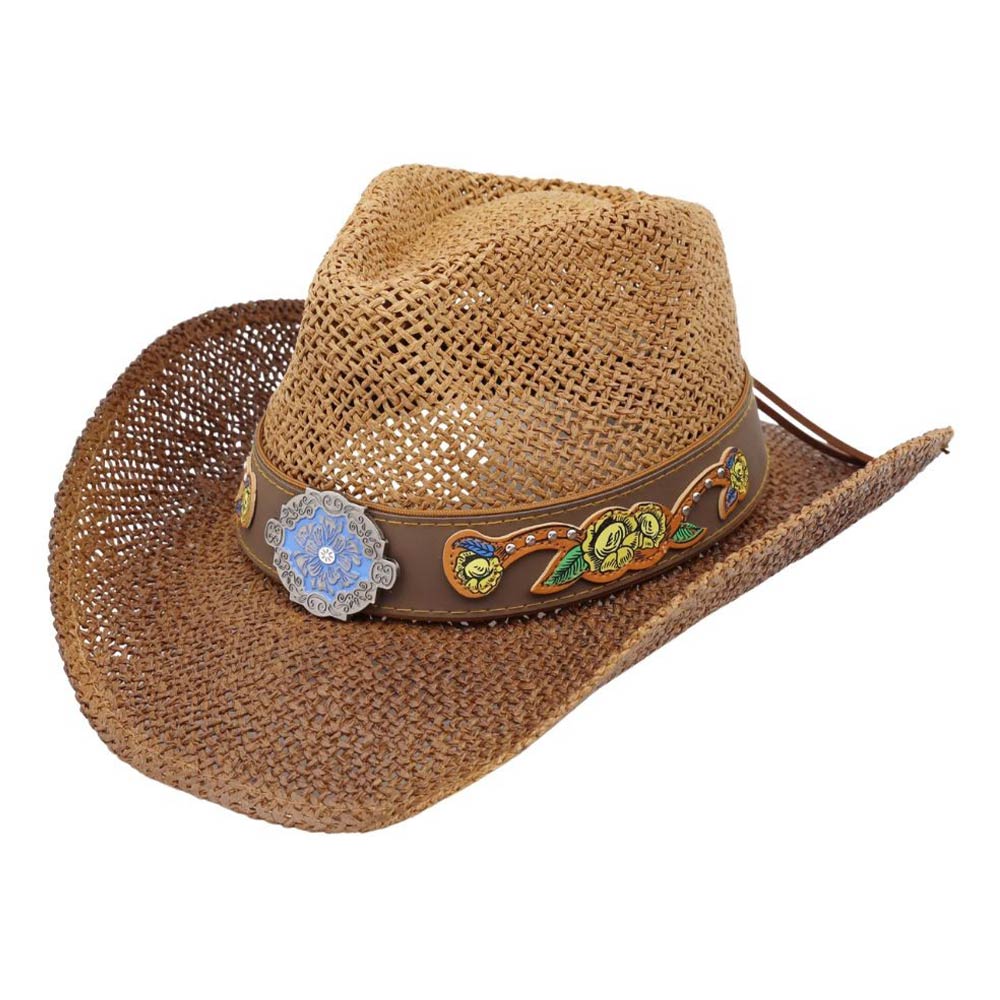 Boho Two Tone Rhinestone Studded Floral Concho Band Western Straw Cowboy Hat