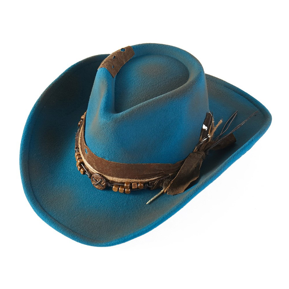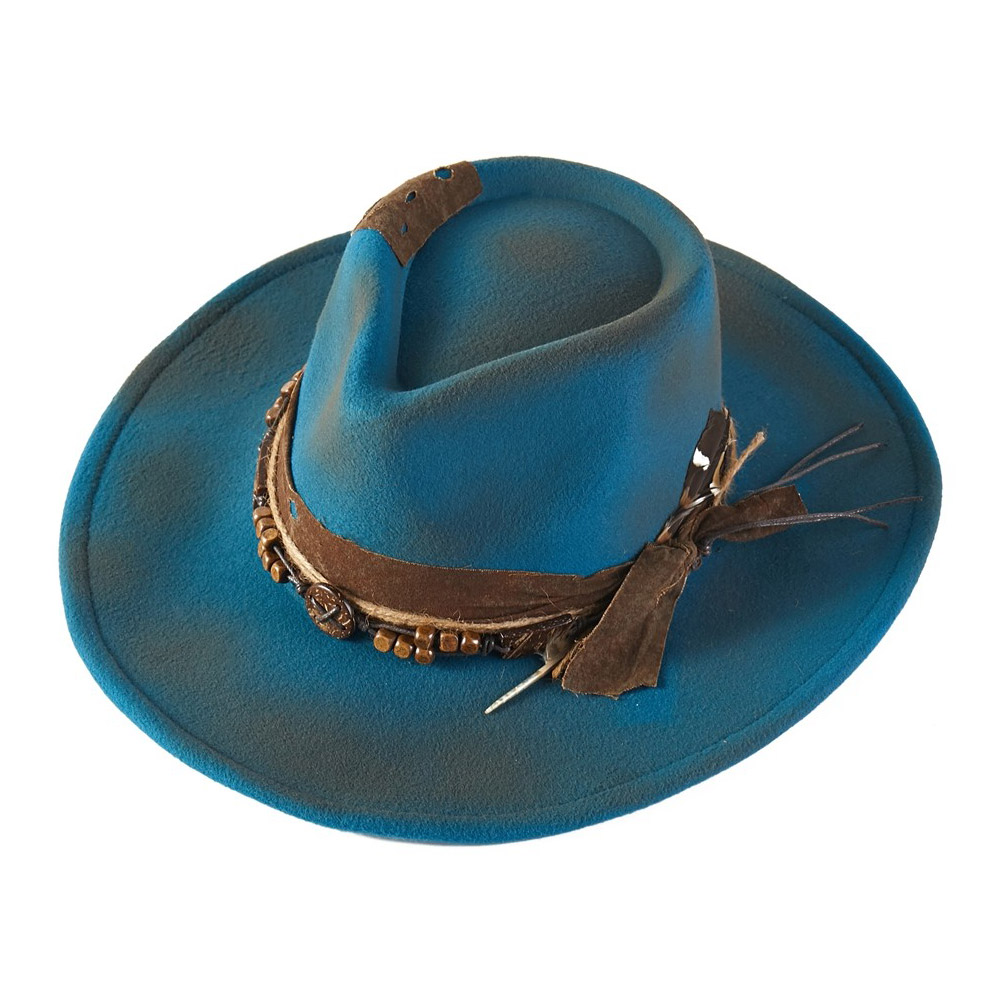 Details • Crown Circumference : 23" • Crown Height : 4.5" • Brim Height : 3.75" • Material : 100% Polyester • Stand out with the Vintage Western Hat featuring a handcrafted feather and bead band for an authentic rustic touch. Its bold design and distressed finish bring effortless western flair, perfect for festivals, adventures, or everyday wear that makes a confident style statement.