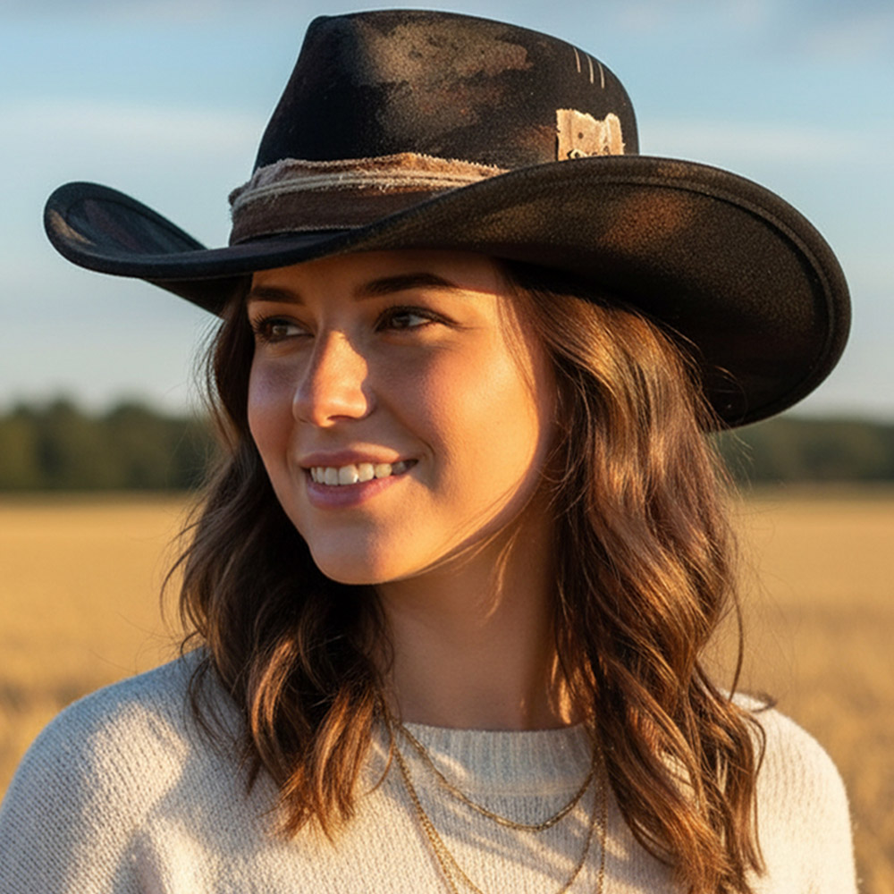 Details • Crown Circumference : 23" • Crown Height : 4.5" • Brim Height : 3.75" • Material : 100% Polyester • Elevate your look with the Vintage Distressed Western Hat, crafted for a bold and rugged statement. Its weathered design and feather detail bring authentic charm to any outfit. Perfect for festivals, casual outings, or themed events, offering comfort and standout western flair.
