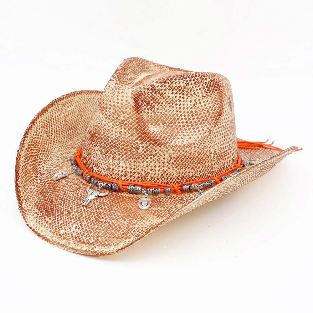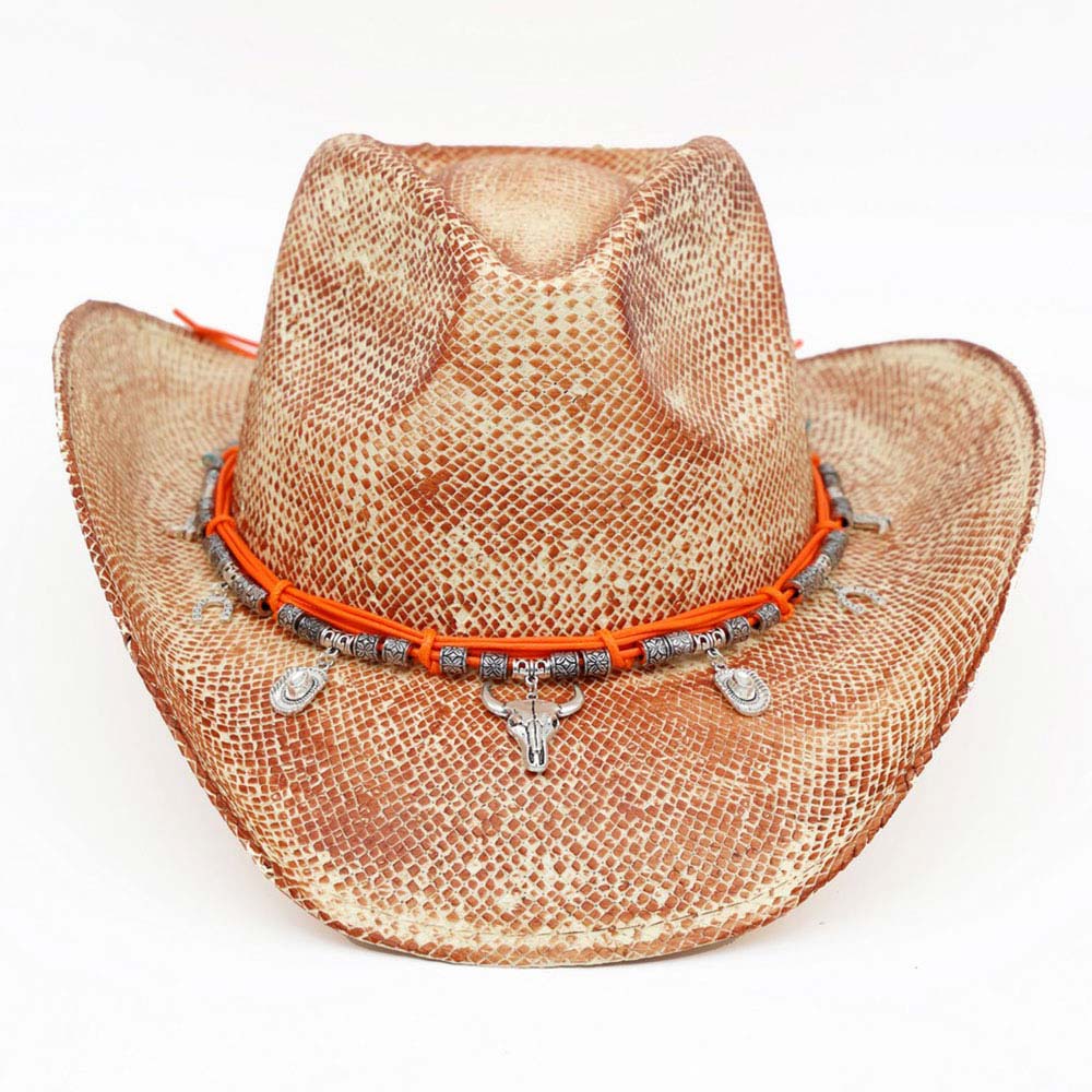 Handmade Vintage Steer Head Cactus Horseshoe Charm Faux Leather Band Western Straw Cowboy Hat