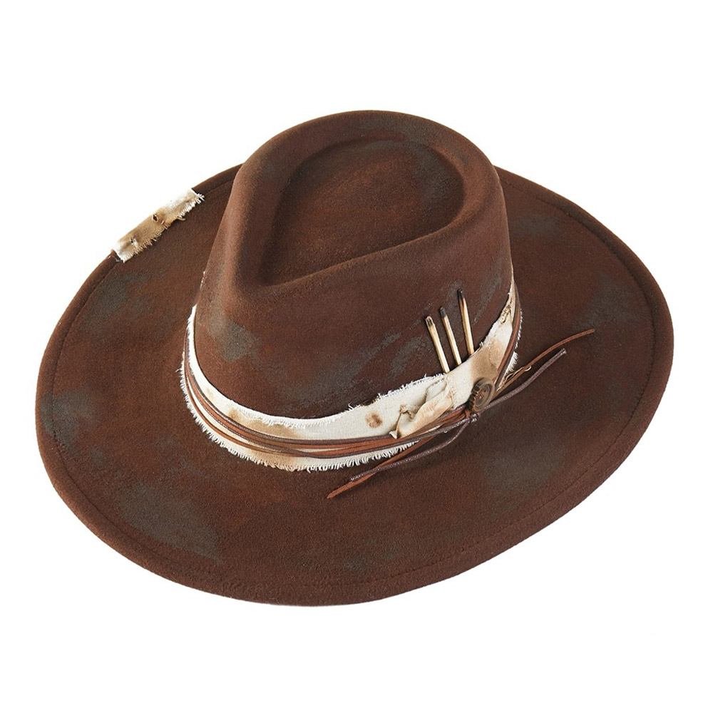 Details • Crown Circumference : 23" • Crown Height : 4.5" • Brim Height : 3.75" • Material : 100% Polyester • Embrace rugged sophistication with the Distressed Western Hat featuring a frayed fabric band and handcrafted detailing. Its vintage finish adds authentic western flair, making it the perfect accessory for festivals, travel, or casual wear with a bold, adventurous edge.