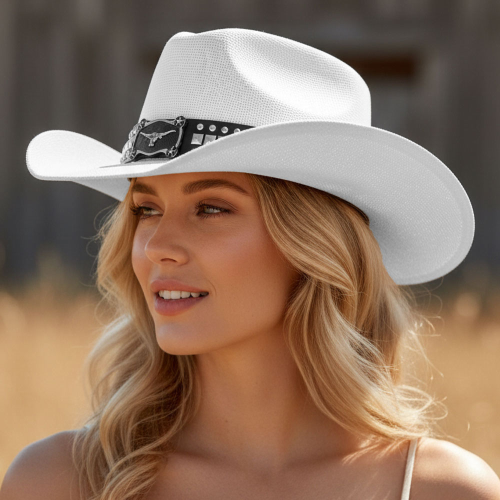 • Statement western cowboy hat featuring a structured crown, curved brim, and a bold studded buckle band with western-inspired detailing. Ideal for rodeo looks, western fashion collections, festivals, stage styling, and themed outfits, offering strong character and eye-catching western appeal.