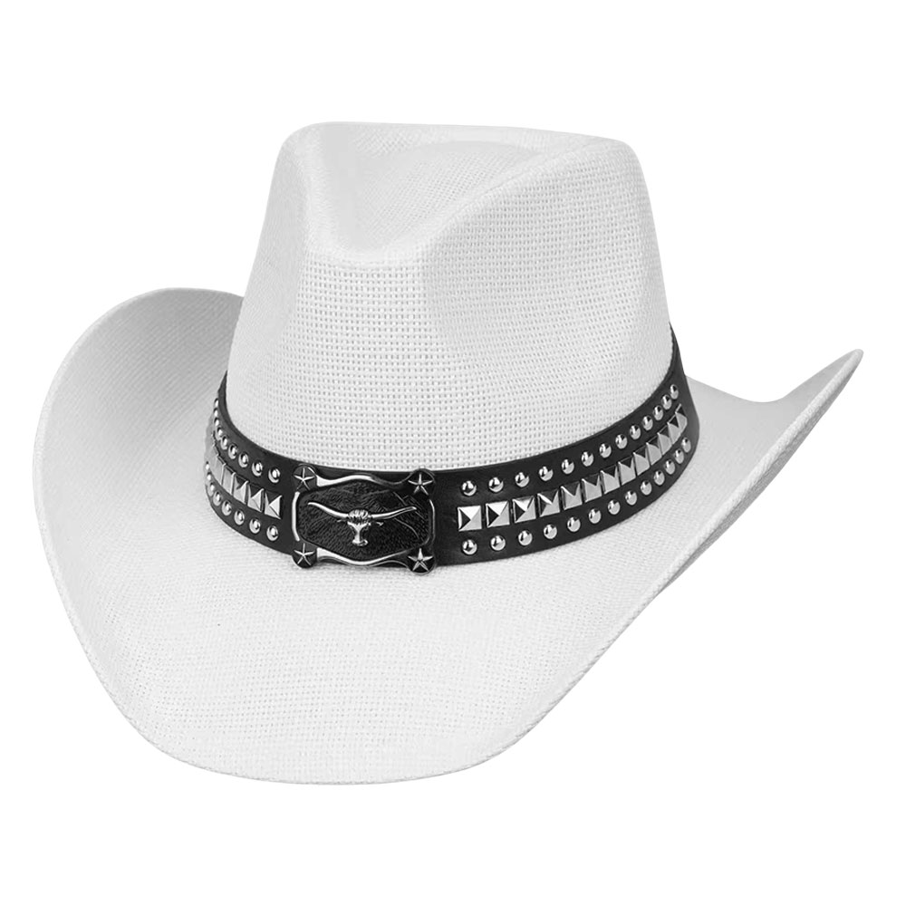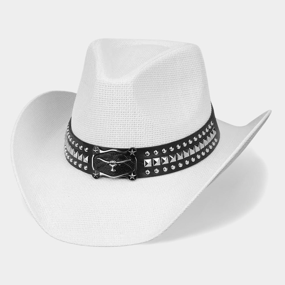 Metal Steer Head Buckle Studded Faux Leather Band Western Straw Cowboy Hat